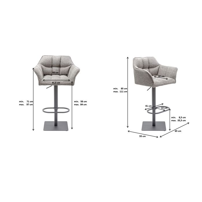 Barska stolica podesiva po visini s rukonaslonima u sivoj boji i udobnim naslonom za noge. Nevjerojatna udobnost sjedenja zahvaljujući raskošnim presvlakama. Atraktivna stolica koja može polsužiti kao stolica u kućnom baru, u kuhinji ili kao stolica za blagovanje na visokim blagovaonskim stolovima.