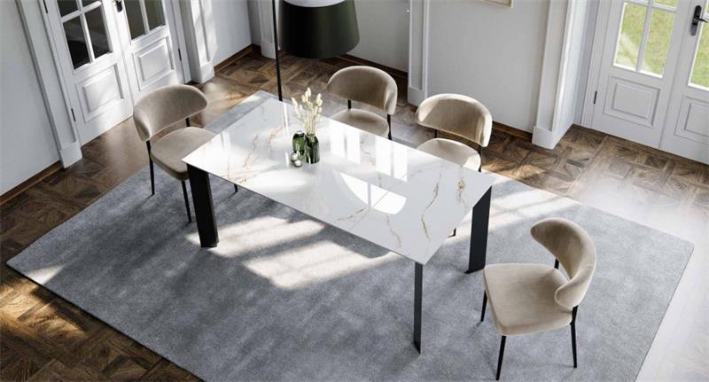 Blagovaonski stol Enezia na razvlačenje kombinira sofisticirani dizajn s praktičnošću, nudeći elegantno i moderno rješenje za svaki blagovaonski prostor. Stol ima ploču od carrara keramike debljine 11 mm u prekrasnom sjajnom finišu, dodajući dašak luksuza i profinjenosti. Ploča se proteže od 130 cm do 180 cm, pružajući svestranost kako za intimne obroke, tako i za veća okupljanja. Ploča stola je dostupna u crnoj i bijeloj boji.