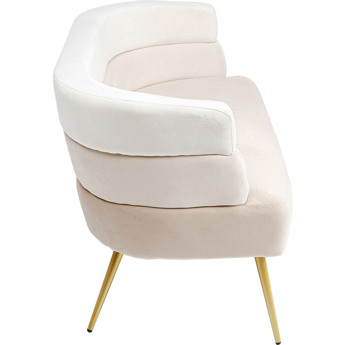 Glamurozno i elegantno: u tri harmonične nijanse krem boje ovaj dvosjed ostavlja dojam svojim skladnim oblinama, delikatnim dimenzijama i posebnim dizajnom. Potpuno tapecirana, kompaktna i baršunasta, ova će sofa pristajati uz sve ideje za opremanje jer se uklapa i u kutak za čitanje ili hodnik. U kombinaciji sa zlatnim nogama od lakiranog čelika, sjajni baršunasti izgled sofe i njen poseban oblik stvaraju neodoljiv izgled u retro stilu. Međutim, dvosjed ne samo da izgleda elegantno, već je i izvanredno udoban s visinom sjedala od 43,5 cm i ugodnim presvlakama. S daškom blistavosti svoju dnevnu sobu možete pretvoriti u svoj mali luksuzni raj zahvaljujući ovom kauču.