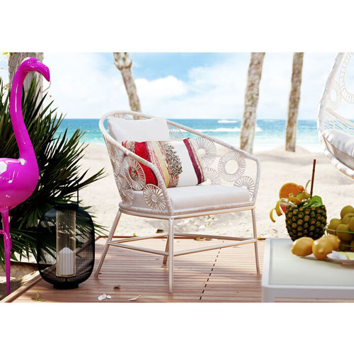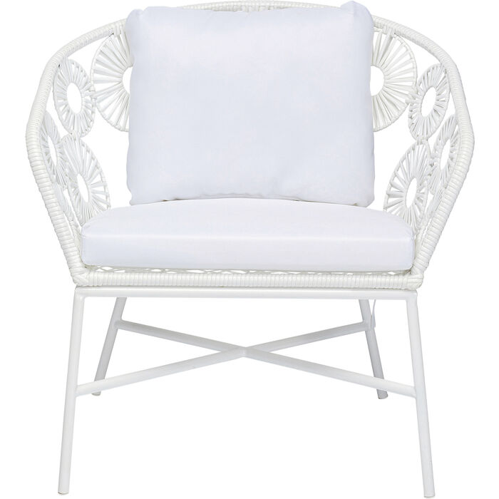Bijela fotelja u boho stilu za vanjsku upotrebu koja može parirati bilo kojoj fotelji u zatvorenom prostoru. Struktura stolice od poliratana s razigranim uzorkom vizualno pluta na terasi ili balkonu. Ova fotelja donosi osjećaj Ibize u vaš dom čak i po lošem vremenu. Uključeni su jastuci za sjedenje i naslone. S kontinuiranom rukonaslonom ova vanjska ležaljka nudi veliku udobnost sjedenja.