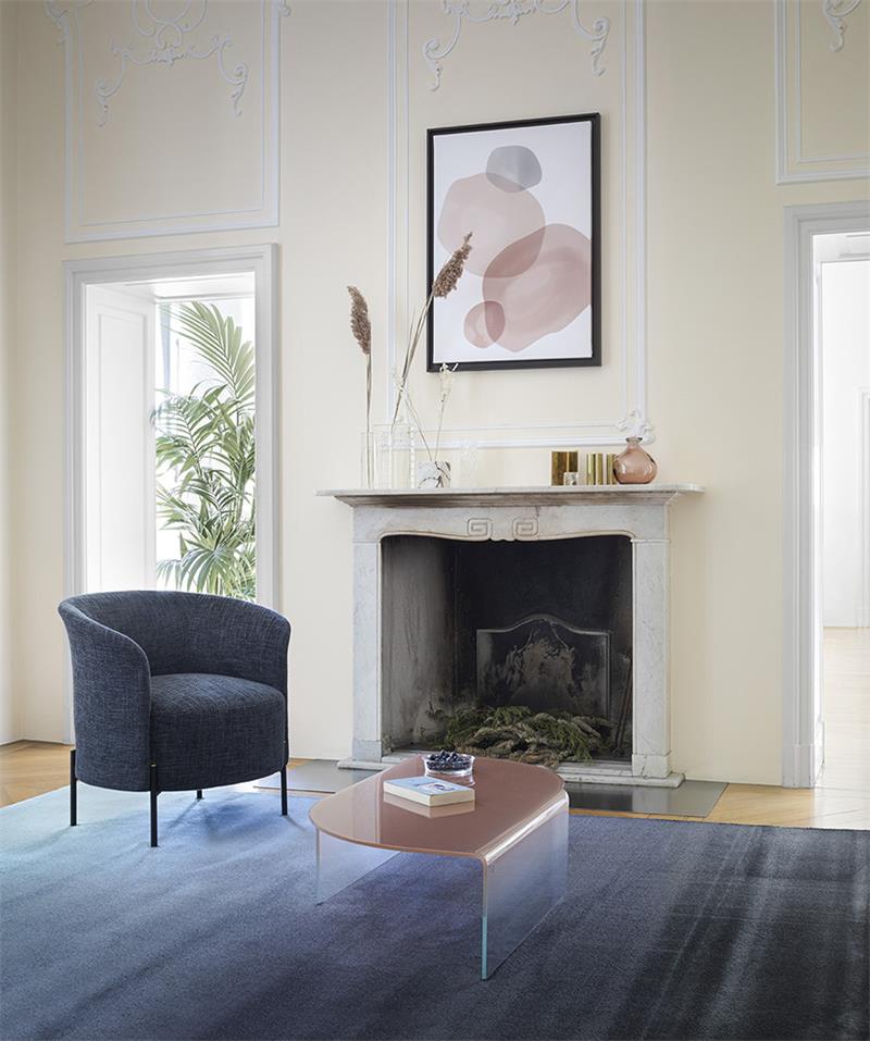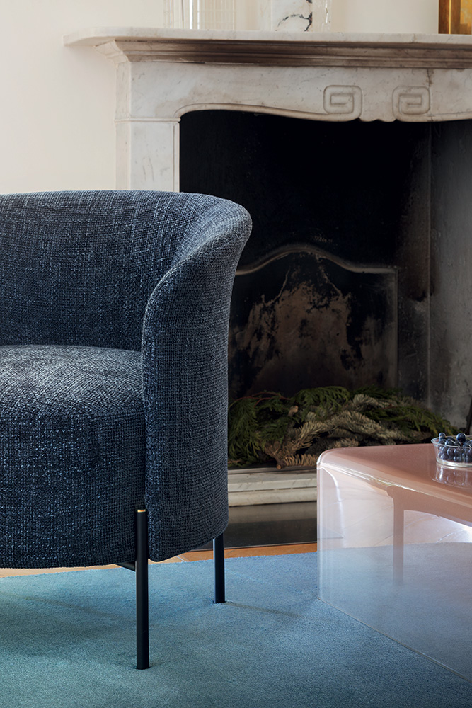 Zamamno udobna i elegantna fotelja za odmor. Tajna iza vitkog dizajna i skladnih oblina je naslon izrađen od prekrivenog i tapeciranog hladno-pjenastog poliuretana. Struktura je postavljena na 4 izložene metalne noge s donjim dijelom u sjajnoj mesinganoj ili crno-niklanoj obradi, što daje elegantan dojam.