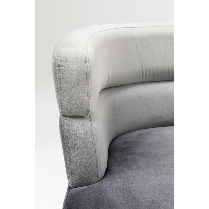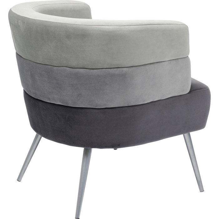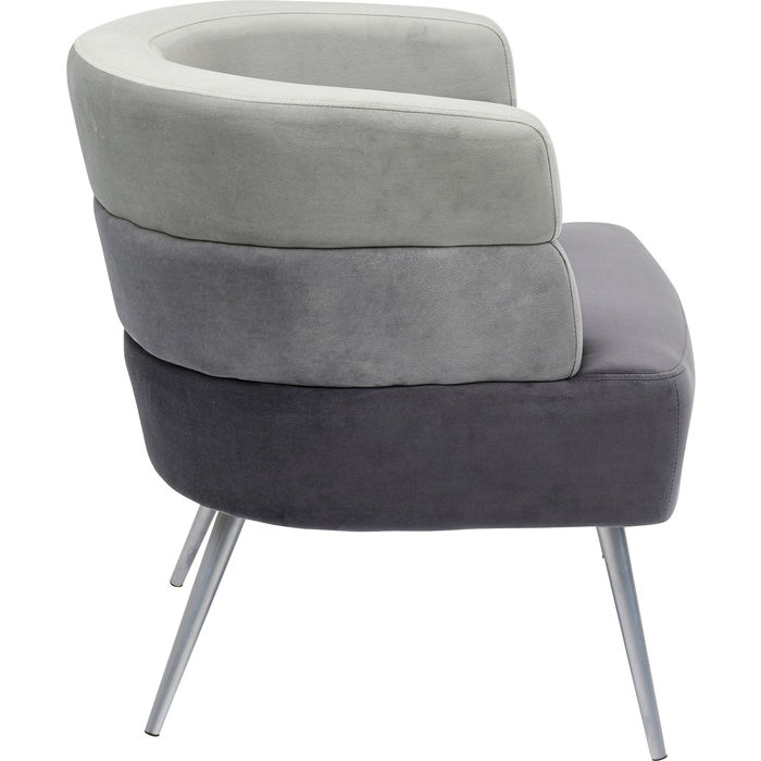 Tapecirana fotelja baršunastog izgleda u nijansama sive boje sa srebrnim nogama. Okrugli, kontinuirani rukonasloni i naslon za leđa čine fotelju udobnom. Tri sive nijanse presvlake i dvodijelni naslon daju joj posebnu dizajnersku privlačnost. Ova baršunasta fotelja manjih dimenzija idealna je i za manji stan, dnevni boravak ili spavaću sobu. Uklopiti će se u svaki stil opremanja, kao i u vaš kutak za čitanje, a zahvaljujući svom atraktivnom izgledu možete ju postaviti bilo gdje.