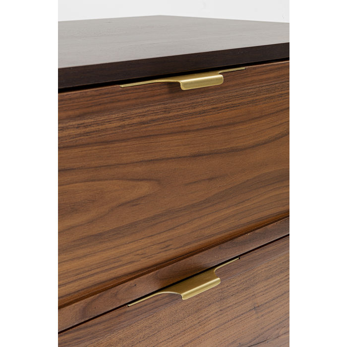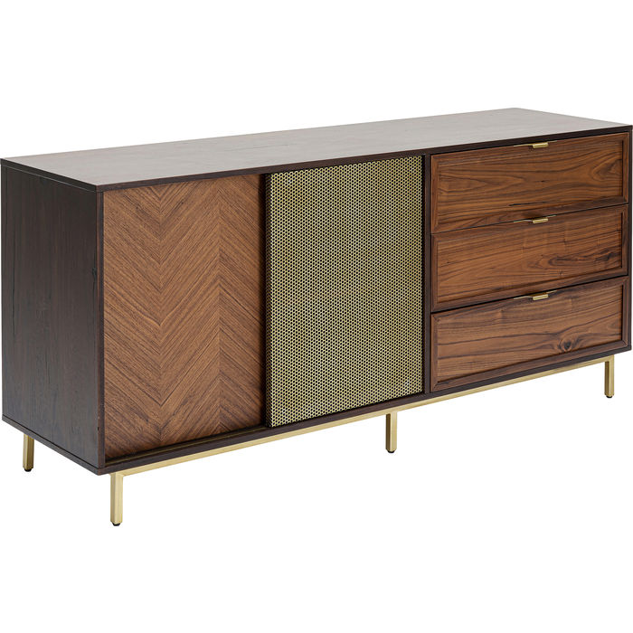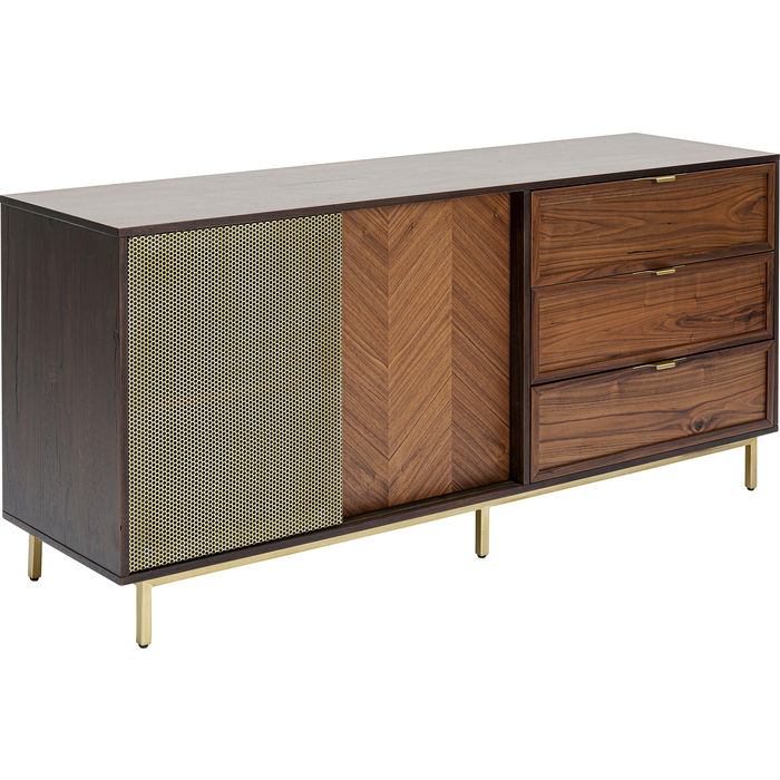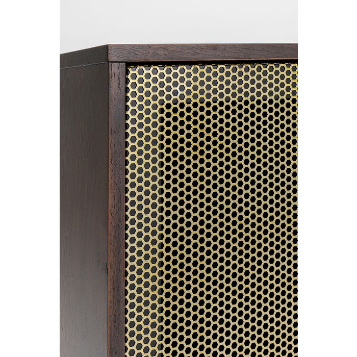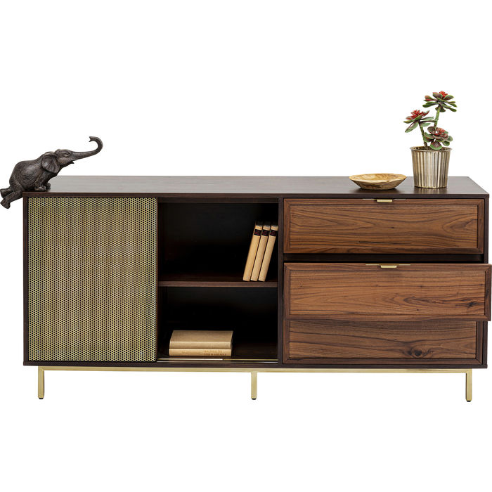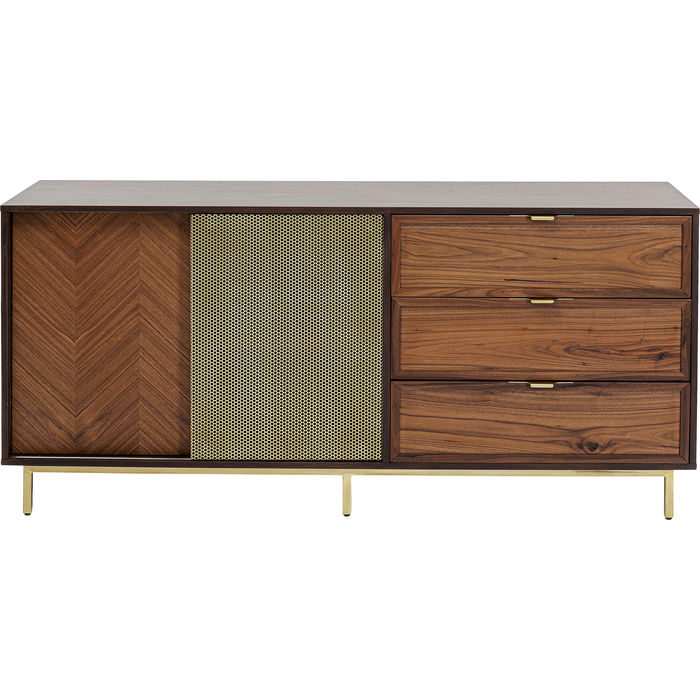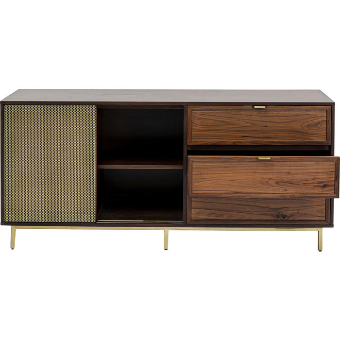 Kvalitetni furnir od oraha fronti i na korpusu čini ovu komodu toliko elegantnom u dnevnoj sobi. Metalni okvir, kvake i klizna vrata su od perforiranog metalnog lima. Komoda pruža prostor za odlaganje u tri ladice (s funkcijom mekog zatvaranja) i dva pretinca s po jednom policom koja je podesiva. Klasičan dizajn namještaja koji diskretno aludira na bogatstvo. Može poslužiti i kao TV komoda.