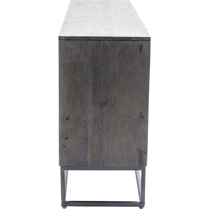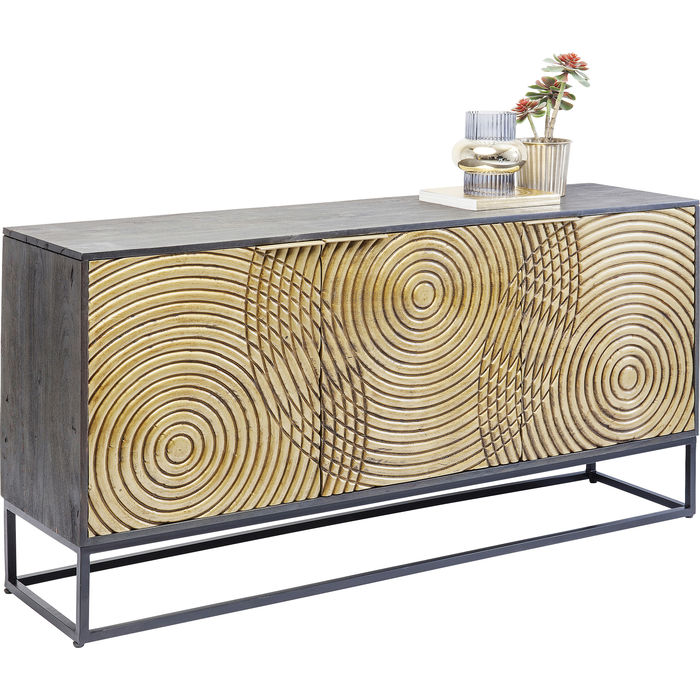 Oblik ove komode od masivnog drveta grafički je i suzdržan, ali uzorak na vratima je čaroban! Bezbrojni krugovi uklesani su u drvo s tankim linijama. Iza troje vrata nalazi se puno prostora za pohranu. Daje prostoriji šarmantan izgled.