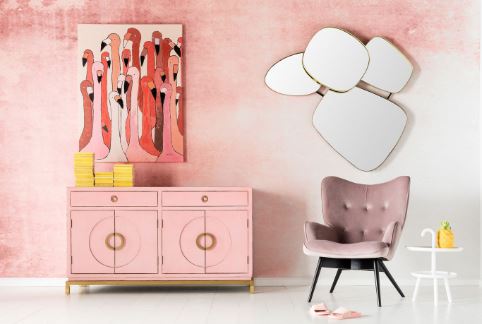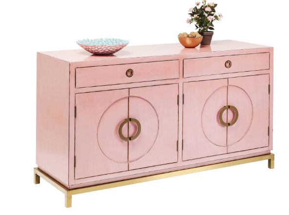 Disk pink komoda u kineskom stilu sa dva dvokrilna elementa i dvije ladice. Komoda je prikaz izvrsne kombinacije čistih, reduciranih oblika, grafičkih elemenata i nježne roze boje koja će vašem domu dati odličan azijski štih. Nogice, podnožje i ručke komode izrađene su od nehrđajućeg čelika obloženog bakrom, vrata od lakiranog medijapana i okvir od lakiranog masivnog drva topole.
