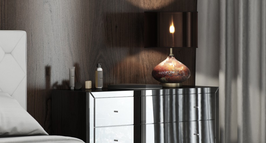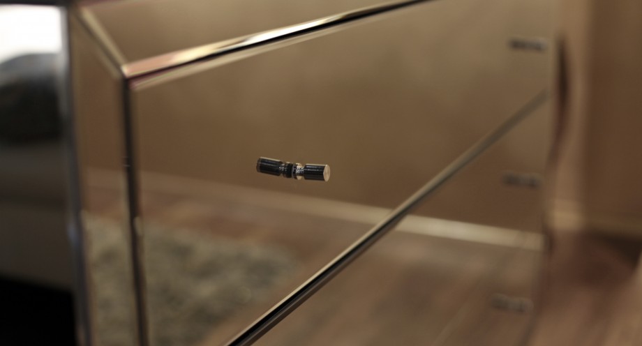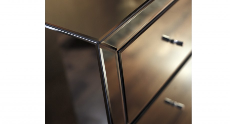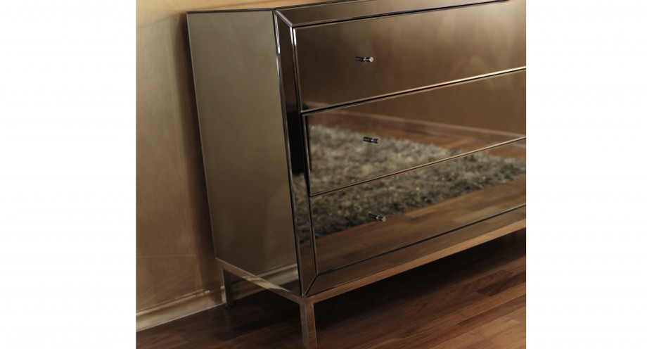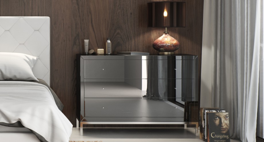 Komoda Fermi izrađena od zrcalnog stakla lijepo će se uklopiti u svaku spavaću sobu. Ručkice i nogice komode su izrađene od nehrđajućeg čelika.