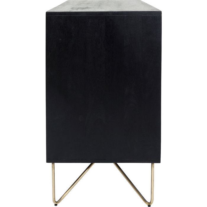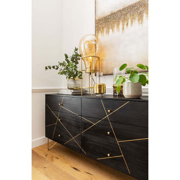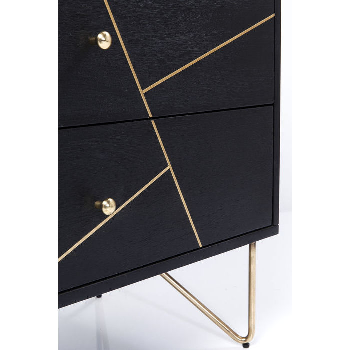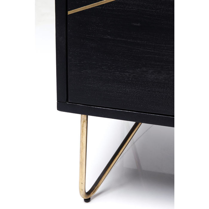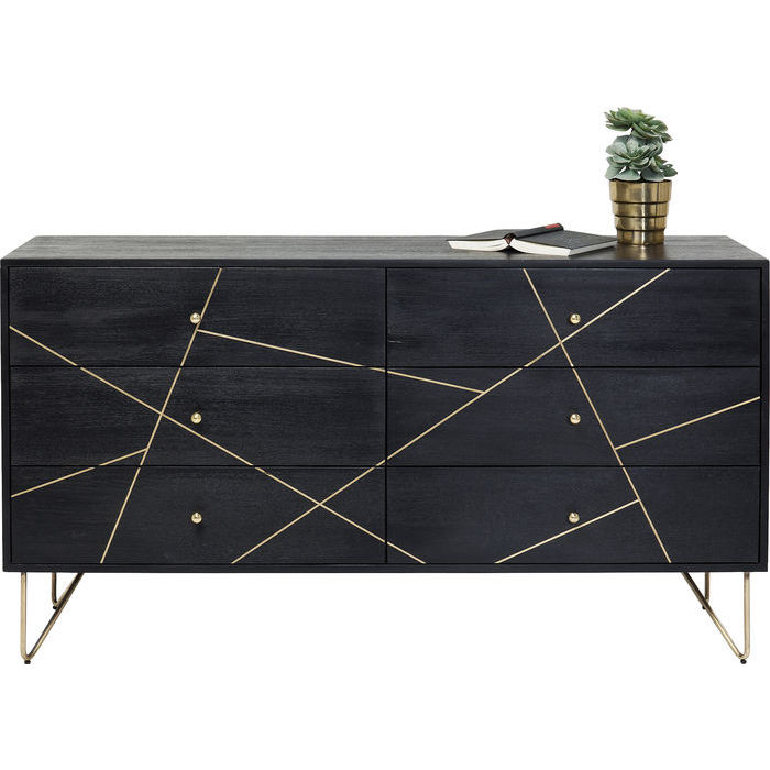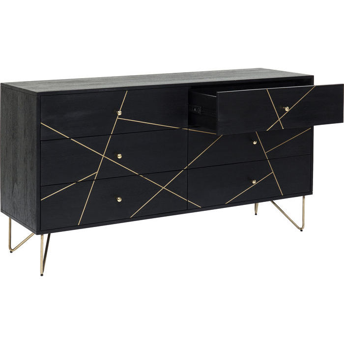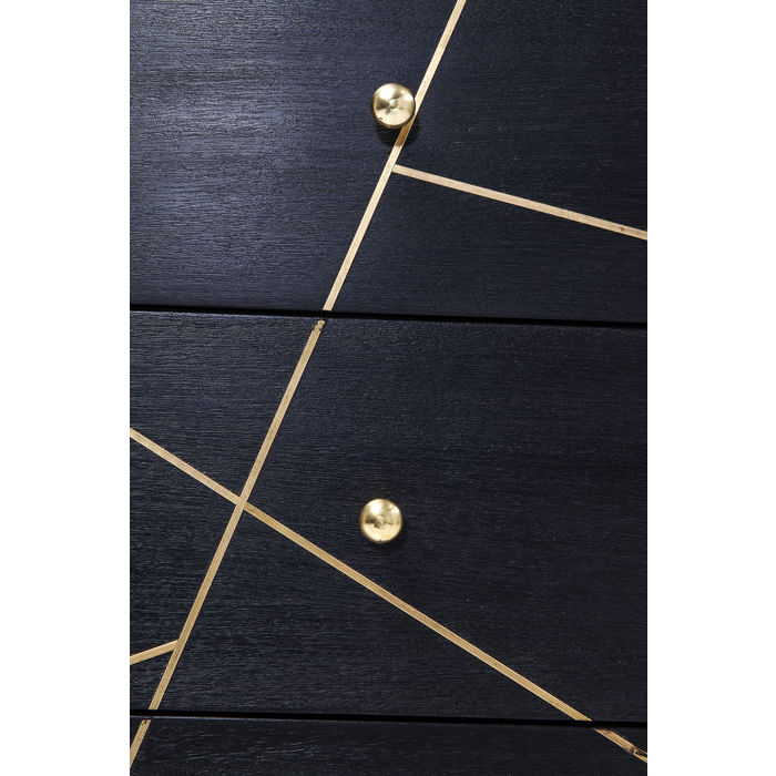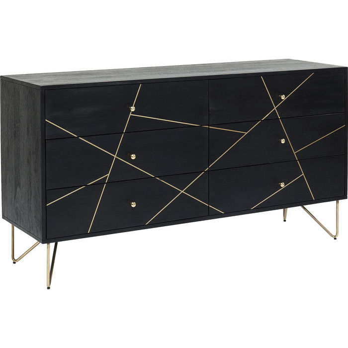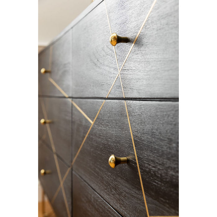 Komoda izrađena od punog drva manga sjajno ispunjava svoj zadatak- sa šest prostranih ladica nudi puno prostora za odlaganje, a istovremeno zrači savršenom crnom lakiranom elegancijom. Komoda je kombinacija korpusa od punog drva, sjajnih zlatnih metalnih umetaka i nježnih okruglih gumba. Čelične noge vješto ponavljaju grafički uzorak na prednjoj strani. Sve u svemu, kvalitetan klasik sa stilskim obrubom.