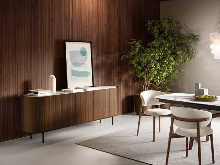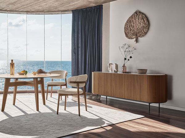 Komoda Lake je komad za dnevni boravak koja se izdvaja svojim uglađenim skladnim linijama. Baza ima ovalni oblik, a njezinu ljepotu pojačava keramička ploča koja je blago odmaknuta od ruba, stvarajući prostor između vrata i ploče što je korisno za otvaranje vrata i ladica. Dostupna je u više boja furnira i keramike stoga će se komoda odlično uklopiti u svaki prostor.