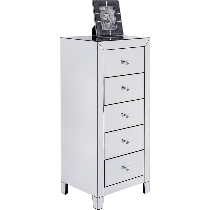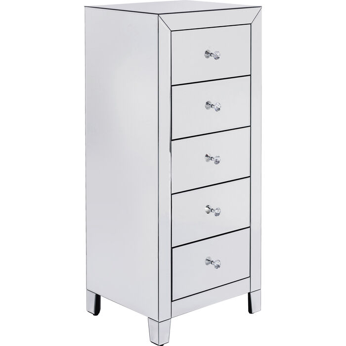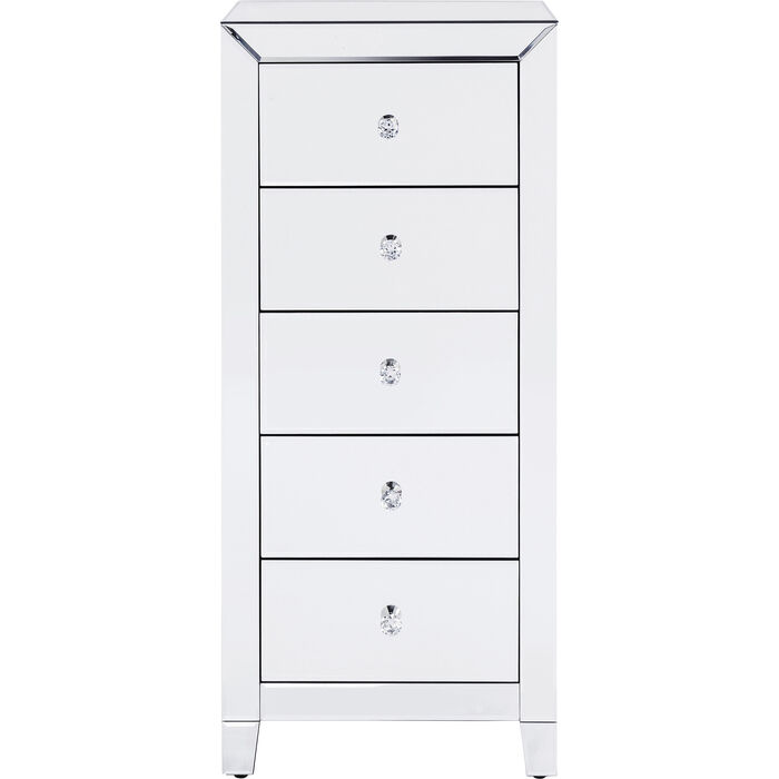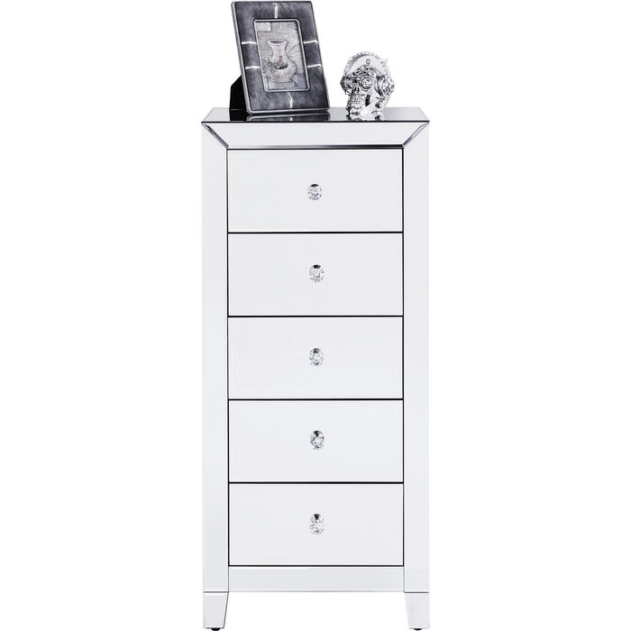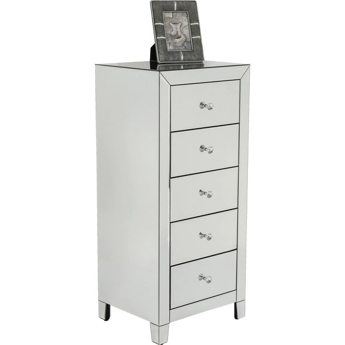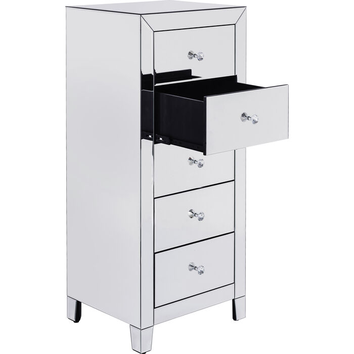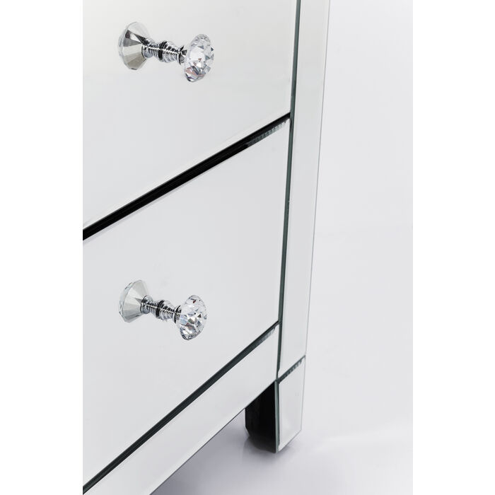 Luksuzna visoka komoda ima zrcalne površine sa svake strane, stvarajući moderan i elegantan ambijent. Ručke su fazetirane ( smanjenje debljine ruba stakla pod određenim kutom u širini od nekoliko centimetara), te naglašavaju aristokratski izgled.