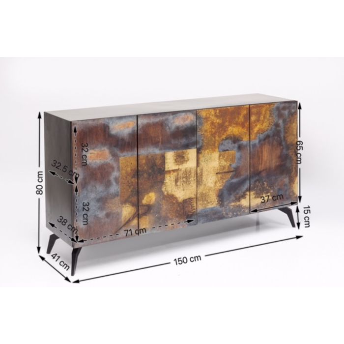 Komoda u industrijskom stilu, koja kao jedinstveni primjerak ima svoj vlastiti karakter zbog prednjih vrata, ručno dizajniranih. Metalni korpus s drvenim vratima, koja pokazuju uzbudljiv gradijent boje. Bezvremenski jezik dizajna i tople boje osiguravaju udobnost.