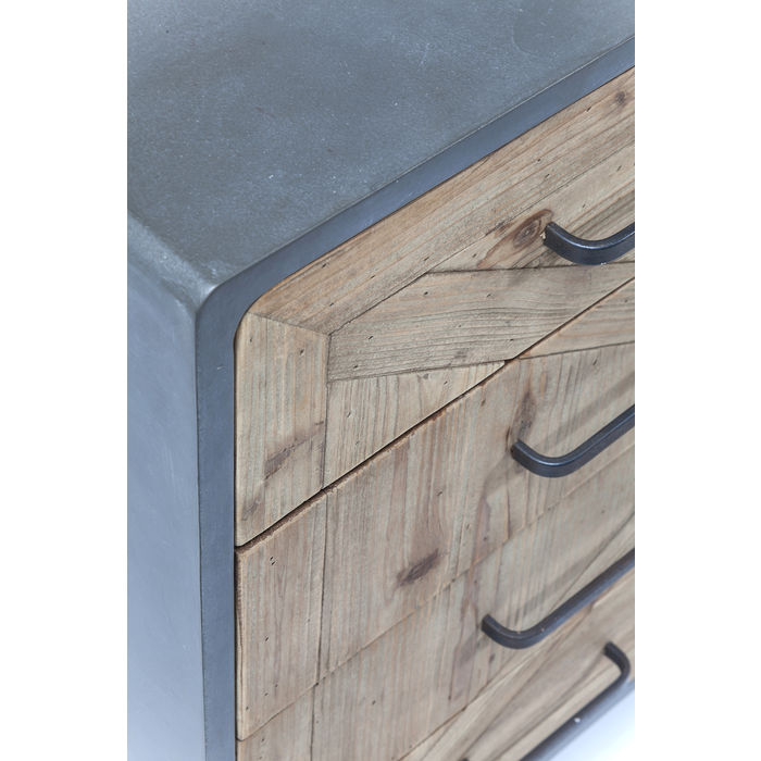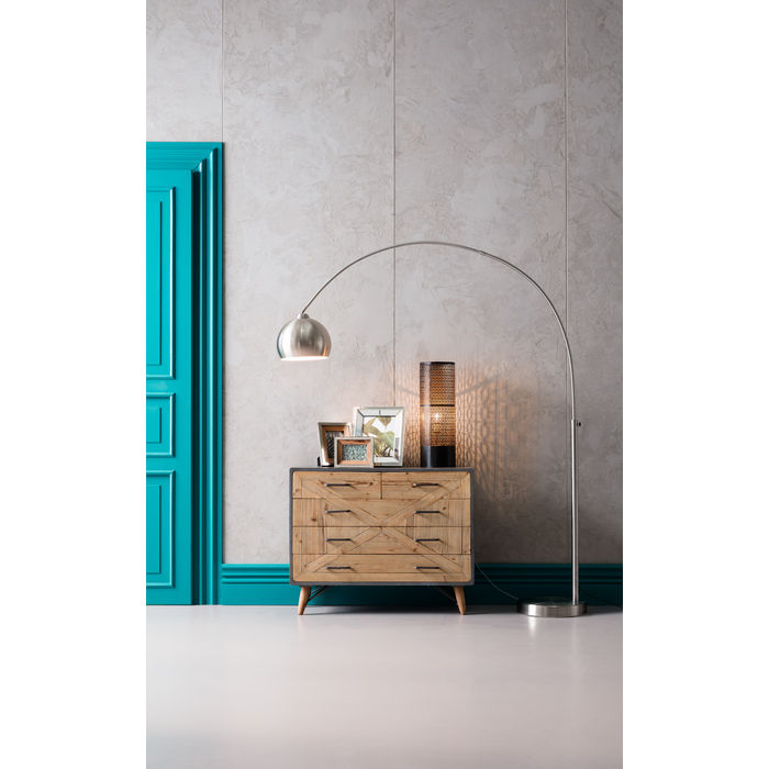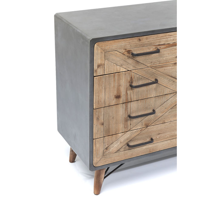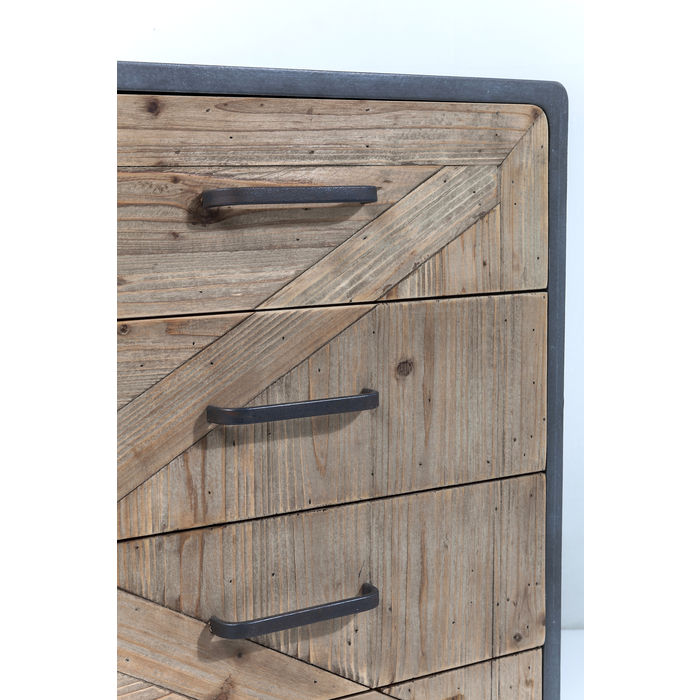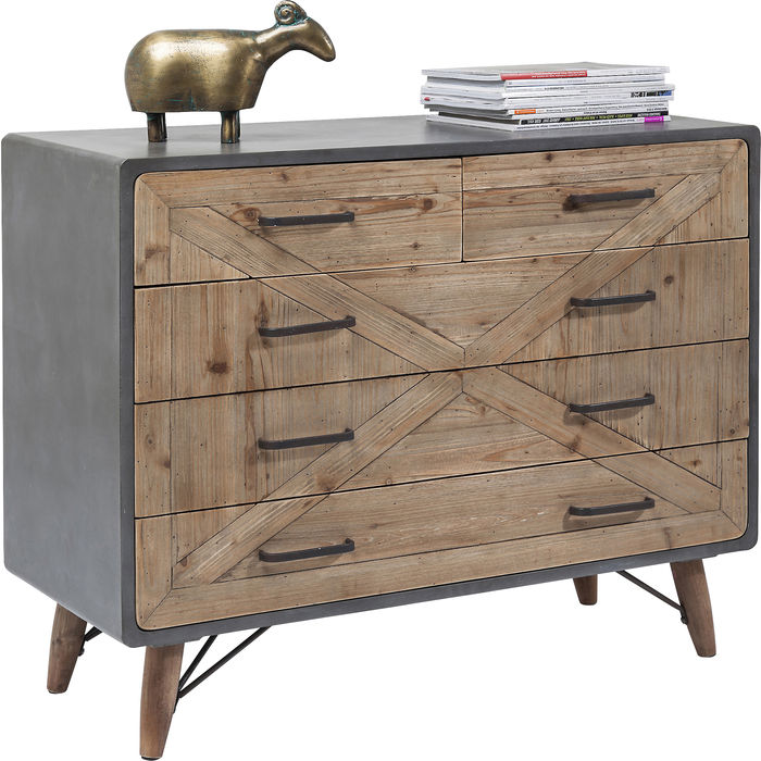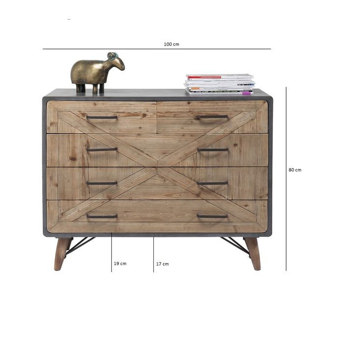 Komoda u industrijskom stilu sa sivo lakiranim korpusom, s metalnim ručkama i neobičnim frotnama od punog drveta jele. Tri široke i dvije uske ladice olakšavaju održavanje stvari. Ova komoda unosi skandinavski stil opremanja u vaš dom. Idealan je dodatak u dnevnom boravku, hodniku ili u spavaćoj sobi kao ormar za posteljinu.