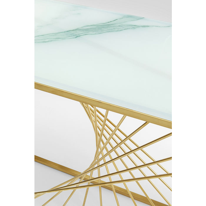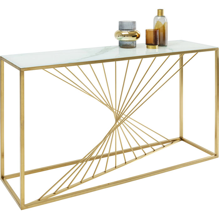 Konzola Art Marble zaista je upečatljiv komad koji će vašem domu dati novi izgled. Trodimenzionalni okvir u zlatnoj boji i bijelo-siva staklena ploča u mramornom izgledu krase ovu konzolu. Može se koristiti i kao komoda u blagovaonici ili u hodniku ukrašena vazama i skulpturama. Ploča konzole jednostavno se čisti vlažnom krpom.
