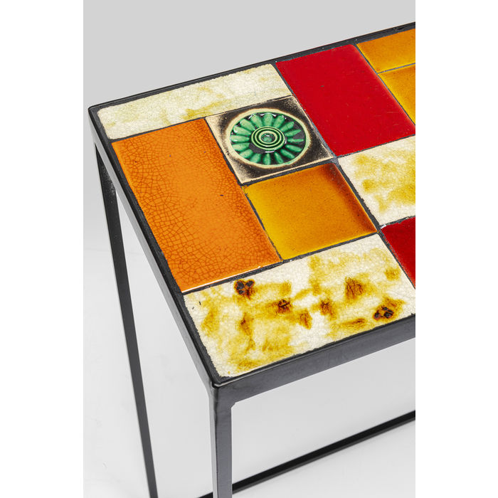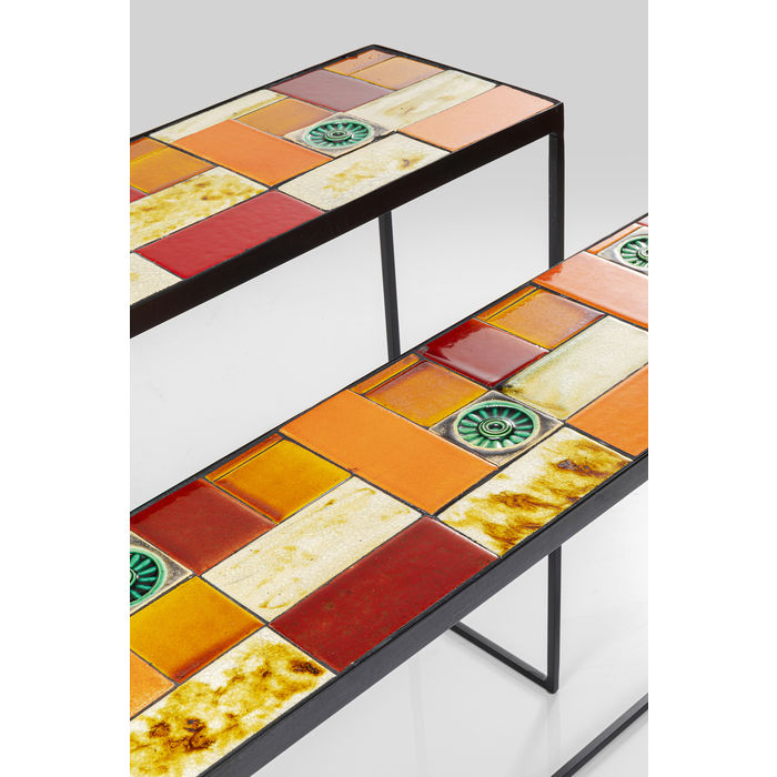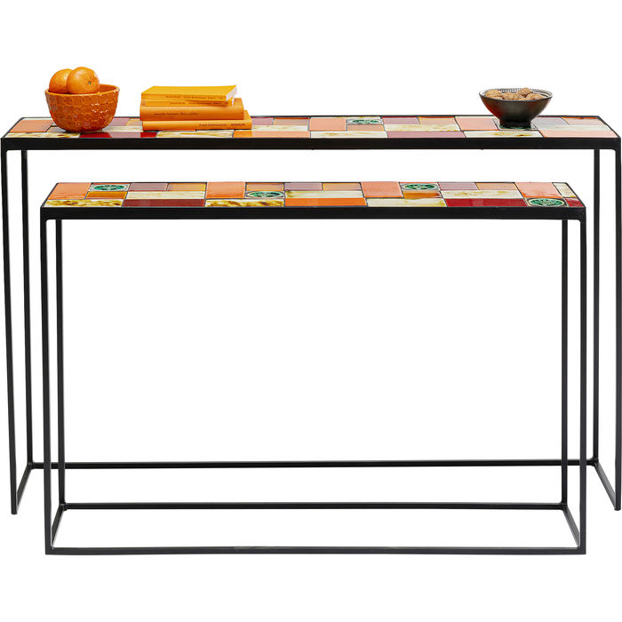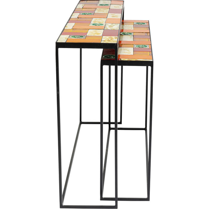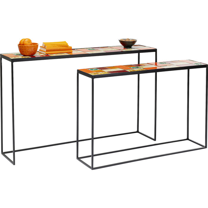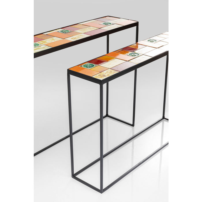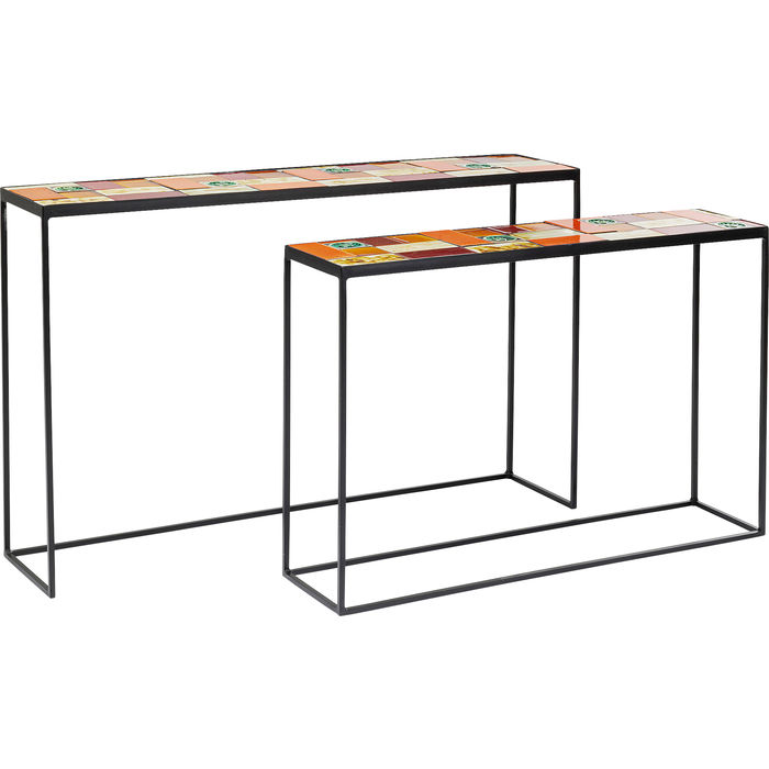 Set od dvije konzole Lisboa kojima je gornja ploča od ostakljene keramike, a struktura je od čelika s premazom u prahu. Gornja ploča je debljine 2,5 cm. Na njoj je uzorak pločica raznih boja i oblika.