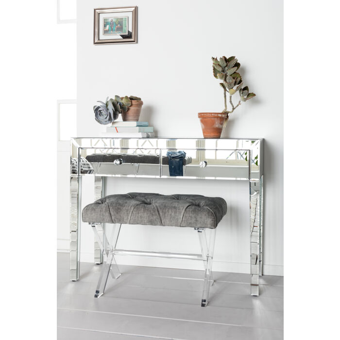 Konzola Luxury ostavlja glamurozan i ekskluzivan dojam. Zrcalne površine i svjetlucave ručke daju mu luksuzni identitet. Konzola ima dvije manje ladice u koje možete pohraniti sve svoje stvari. Konzola Luxury idealno može služiti kao make-up komoda za ljepše polovice.