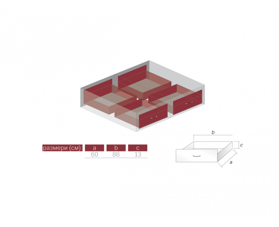 - Baza dolazi s dvije ili četiri (ovisno o dim. kreveta) bočne ladice dimenzija 86x60x13h cm