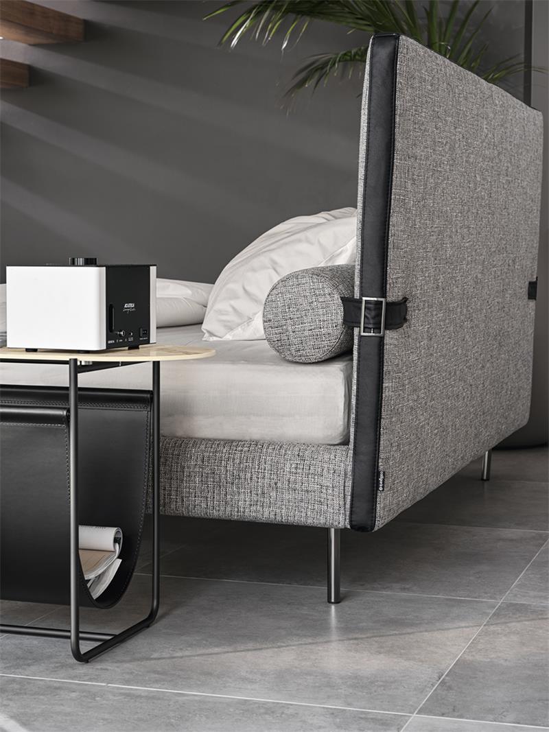 Ovaj se krevet može pohvaliti s nekoliko upečatljivih karakteristika. Jastuci (opcionalni) su pričvršćeni za naslon za glavu praktičnim magnetskim učvršćivanjem, te se mogu ukloniti kad god Vi to poželite. Naslon za glavu opasan je ukrasnom trakom koja se može napraviti u kontrastu s bazom koristeći drugi materijal ili završnu obradu. Vitke cilindrične noge pridržavaju naslon za krevet. S potpuno uklonjivim navlakama, ovaj krevet dolazi u tkanini ili koži.