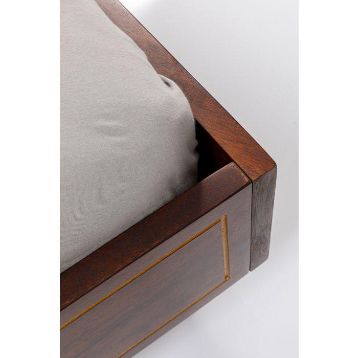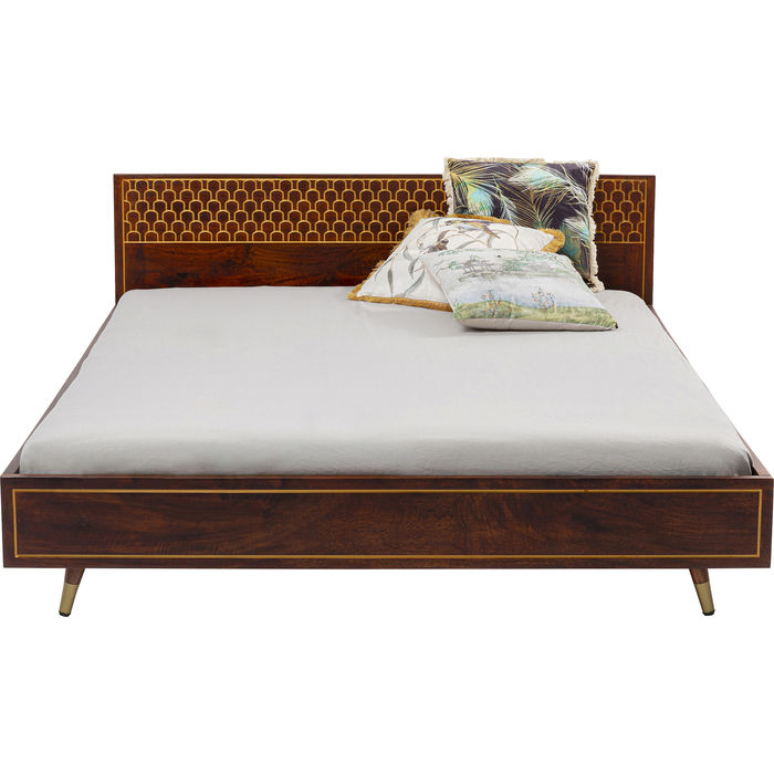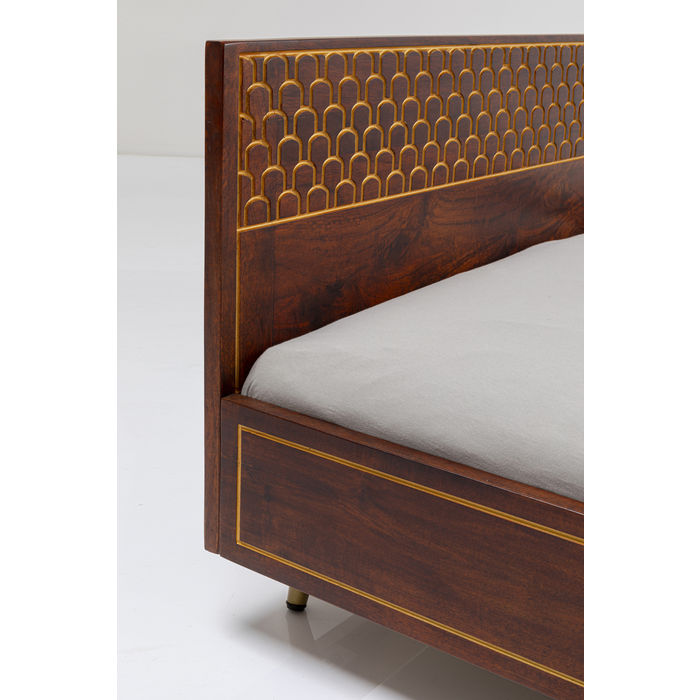 Ovaj krevet ima retro stil s lakiranom mango strukturom u kombinaciji sa zlatnim detaljima. Uzglavlje je ukrašeno motivima Art Decoa koji namještaju daju šik i profinjen stil. Uskladite ga sa ostalim komadima iz kolekcije Muskat.