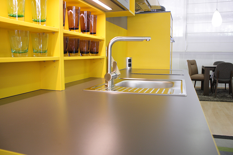 Korpus i unutarnje police izrađeni su od visokokvalitetne iverice debljine 16mm obostrano premazane melaminskom smolom. Dio elemenata debljine je 19mm, a bridovi su izdržljivi zbog mekanog zaobljenja i polipropilenskog obruba. Stražnji bridovi obavezno su premazani sredstvom za zaštitu od vlage. Vrata kuhinja dostupna su u deset cjenovnih razreda, ovisno o materijalu izrade: – iverica i folija – MDF i folija – lakirani MDF – puno drvo i furnir. Sve radne ploče su izrađene od troslojne iverice obložene otpornim plastičnim laminiranim pločama, otpornima na vrućinu do čak 180°C uz nezaobilaznu otpornost na grebanje i habanje.