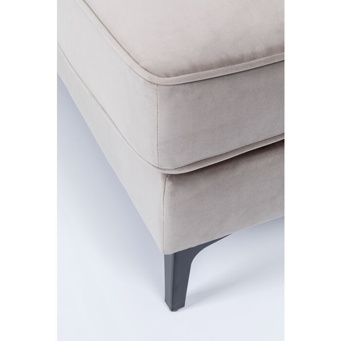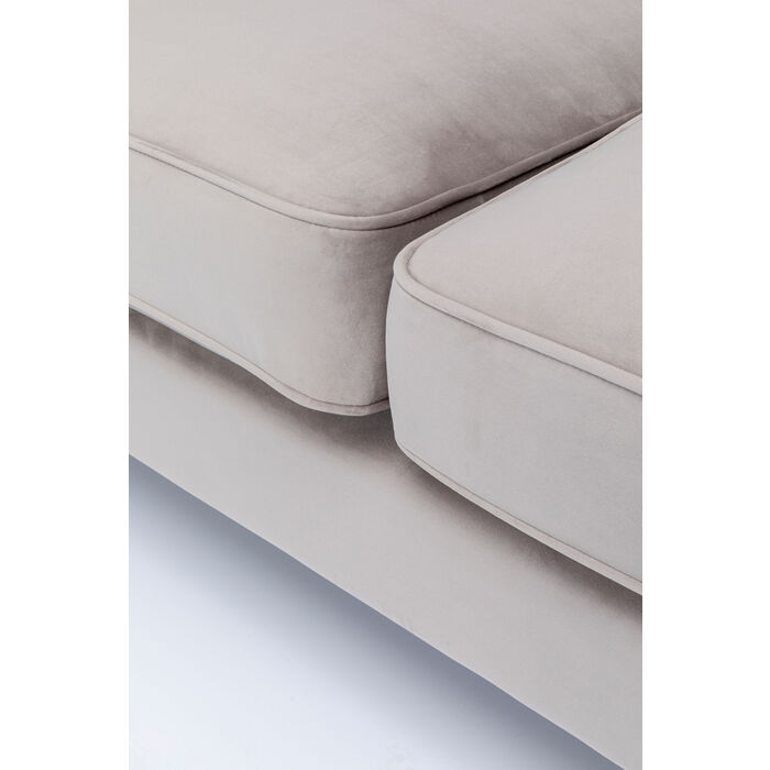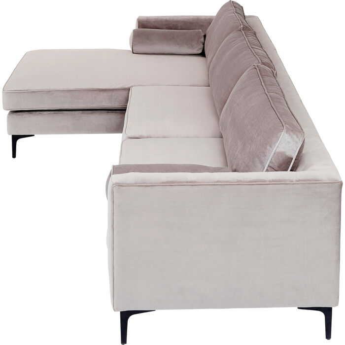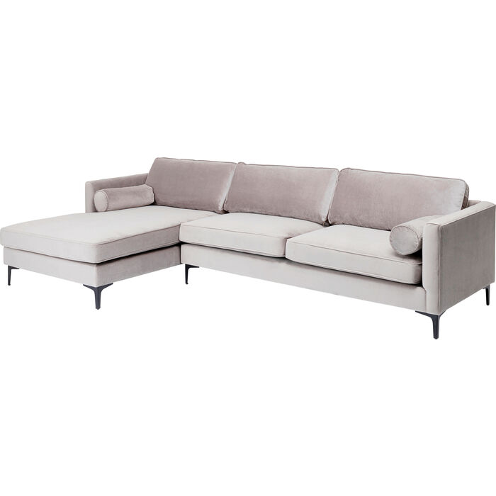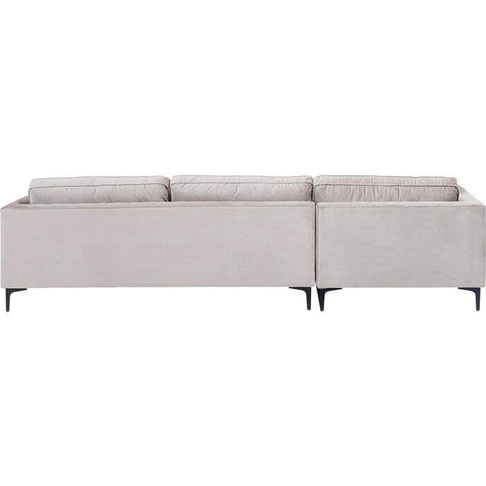 Ova kutna garnitura uklapa se u elegantne i moderne interijere. Njezina siva baršunasta tkanina mekana je na dodir i posebno se dobro uklapa s crnim metalnim ili kromiranim namještajem. Zahvaljujući udobnom sjedalu od 288 cm, pruža prostor za 4 do 5 osoba. Može se naručiti s lijevim ili desnim kutom.