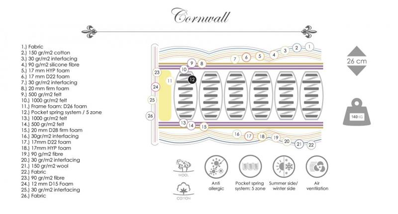 Cornwall je madrac visine 26 cm koji omogućuje čvrst i ugodan san. Kombinacija je dvije strane: na zimskoj strani nalazi se vuna, a na ljetnoj pamuk. Izuzetno čvrsti madrac za težine do 140 kg i ima ugrađeni otvor za pojačavanje protoka zraka. Masažni sloj pjene stimulira i opušta svaki djelić vašeg tijela pa ćete se sigurno svako jutro probuditi odmorni.