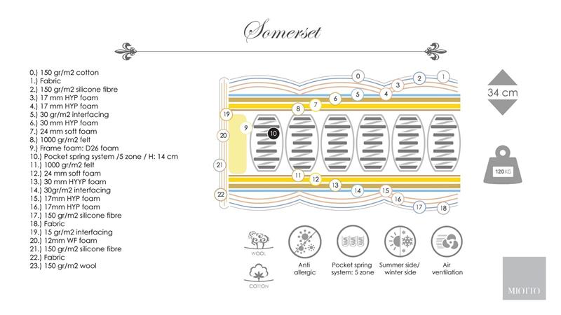 Somerset je madrac visine 34 cm koji daje izrazitu udobnost kod spavanja. Kombinacija različitih pjena u završnim slojevima jezgre daju na izuzetnoj udobnosti. Madrac se preporuča za osobe težine do 120 kg i ima ugrađeni otvor za pojačavanje protoka zraka. Madrac je srednje tvrdoće.