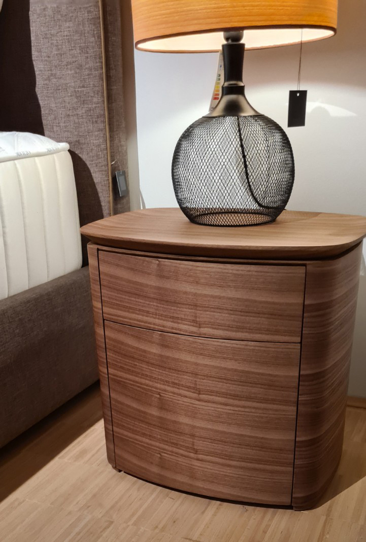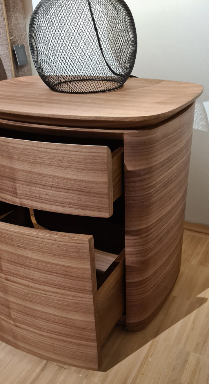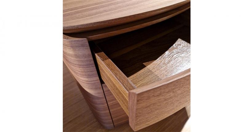 Noćni ormarić od orahovog furnira s dvije ladice za pohranu. Gornja ploča u obliku pladnja. Njegov zaobljeni oblik dodaje zabavan geometrijski element u spavaću sobu, dok orah dodaje osjećaj luksuza.