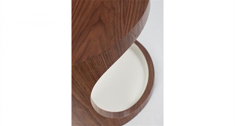 Pomoćni stolić od furnira od oraha i mat bijelog MDF-a. Vanjski dio stolća je od furnira, a unutrašnjost od bijelog MDF-a. Moderan okrugli dizanj stolića sa rupom u sredini omogućava dodatni prostor za odlaganje stvari. Stolić je impresivni modni dodatak koji se uklapa u bilo kojoj prostoriji.