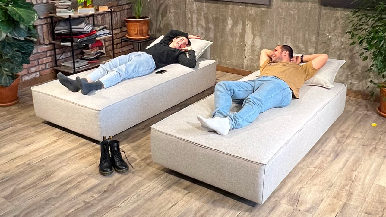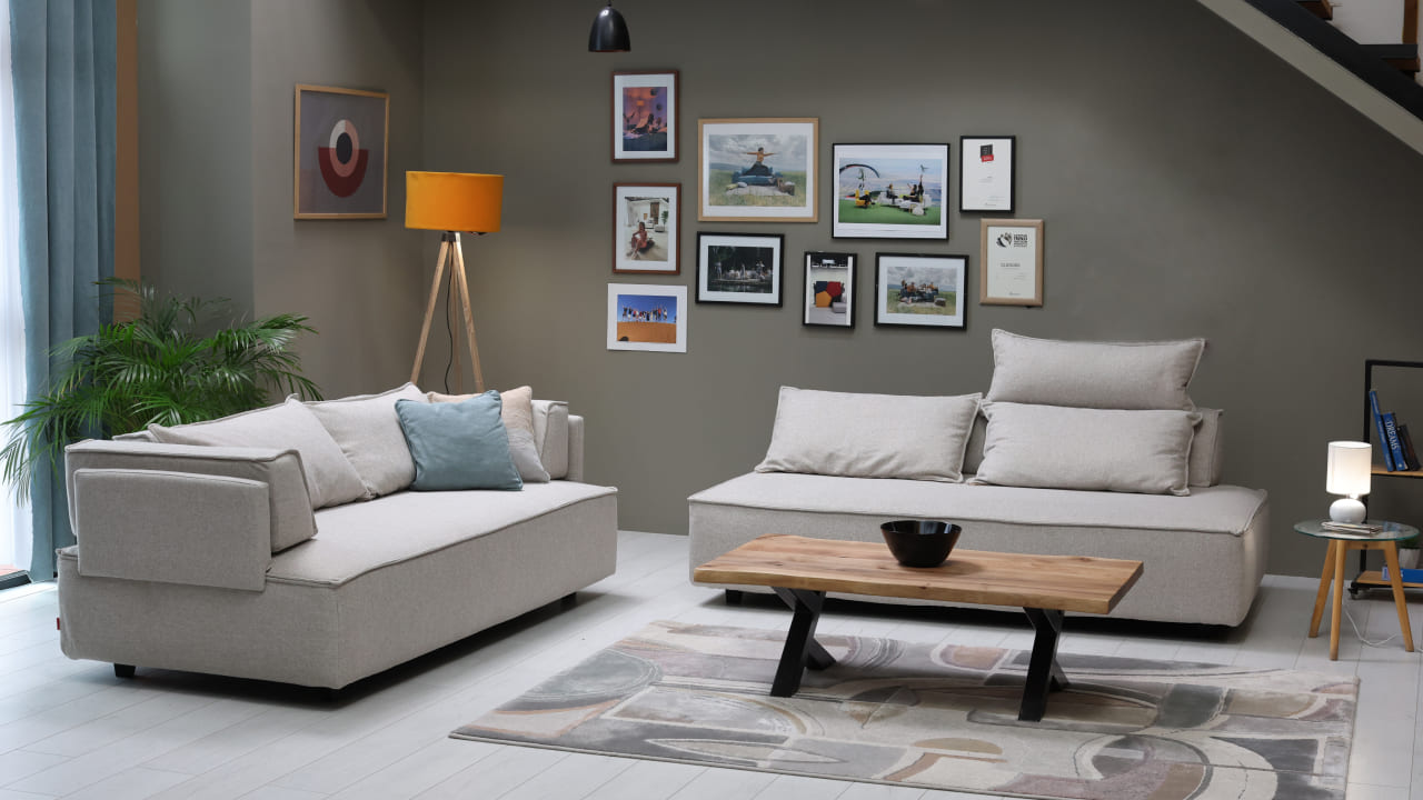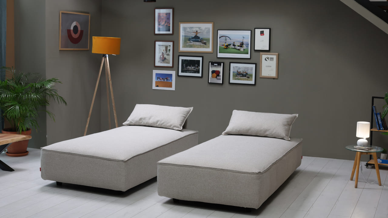 Okrugle noge visoke 8 cm čine garnituru još sofisticiranijom, a možete ih naručiti u svijetlijoj ili tamnijoj varijanti. Ispod svakog elementa je prostor za odlaganje u koji možete spremiti stvari. Sve elemente možete pričvrstiti posebnom metalnom spojnicom i čičkom, tako da će svi elementi ostati na mjestu kada je to potrebno. Garnitura se vrlo lakom preraspodjelom i micanjem elemenata pretvara u ležaj za 2 osobe.