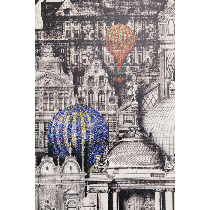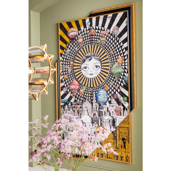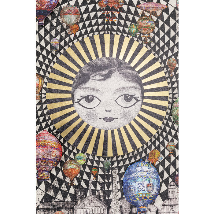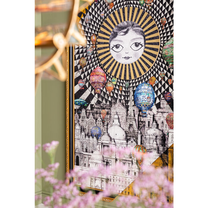 Ova XXL slika sa svojim šarenim maštovitim motivom pravi je umjetnički ukras za zid. Neki elementi, poput lica u sredini i šarenih balona, ??nameću se na uokvirenu sliku kako bi se stvorio impresivan trodimenzionalni efekt. Motiv je otisnut na umjetničkom papiru i daje dnevnim ili spavaćim sobama s visokim stropovima izvanredan stil. Ekskluzivan i umjetnički karakter osigurava neobičan okvir od punog drveta. Impresivan objekt za predvorje hotela, recepciju u uredu ili zidove restorana.