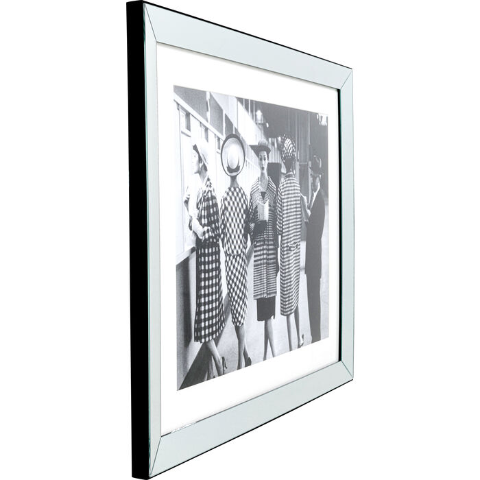 Ova slika tipična je za modnu fotografiju pedesetih godina i dodaje ženstveni glamur svakoj sobi. Čeitiri dame prestavljaju najnoviju modnu kolekciju, a cijela slika je pomalo humoristična. Kombinirajte ovu crno-bijelu uokvirenu sliku sa drugim crno-bijelim motivima i stvorite impresivan zid sa slikama.