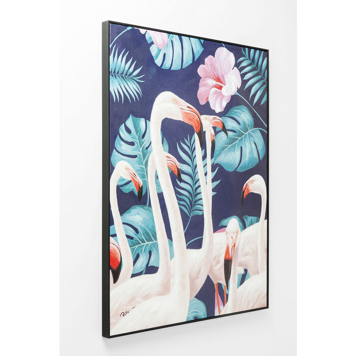 Ovaj osjećaj prenosi skupina flaminga ležernog izgleda. Zbog impresivnog formata i upečatljive pozadine, ručno dovršena akrilna slika djeluje posebno izražajno. Tamni temeljni premaz mu daje eleganciju.