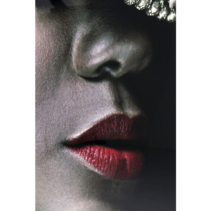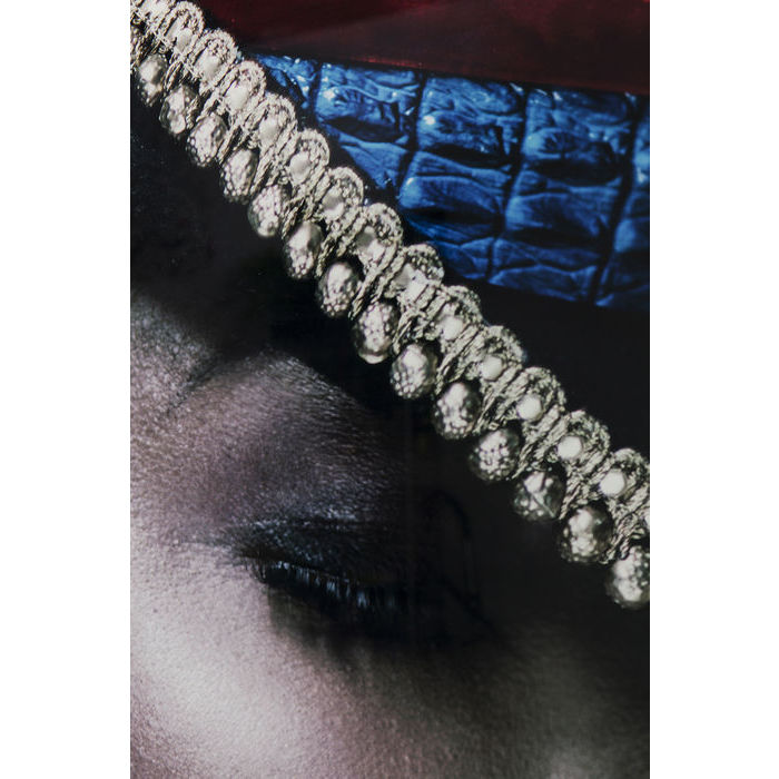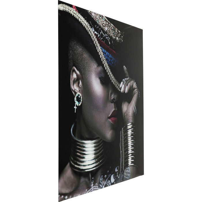 Estetska foto umjetnost u kvadratnom formatu - dodaje snagu i umjetnički kontrast zidu iza slike. Ispisana na staklu i bez okvira, slika izgleda čisto i moderno. Na slici je prikazan ženski model i prevladavaju tamni tonovi.