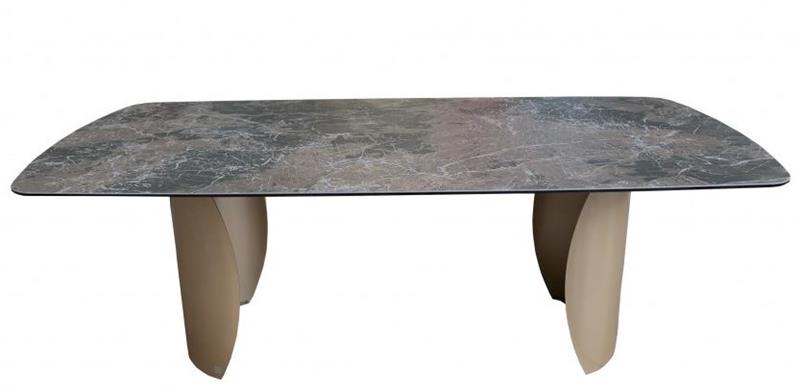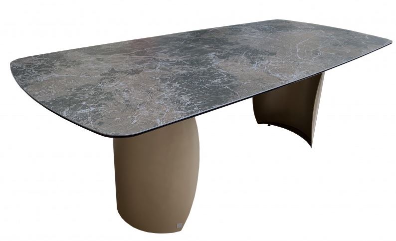 Blagovaonski stol Arona se ističe svojim dizajnom i izdržljivim kvalitetnim materijalima. Ovaj blagovaonski stol se sastoji od ploče od talijanske keramike i kaljenoga stakla koja leži na čeličnom postolju boje šampanjca. Površina ploče je ukrašena bijelim žilama koje, zajedno sa zaobljenim čeličnim nogama, doprinose luksuznom dojmu cijele Vaše blagovaonice. Stol Arona sa svojim čistim geometrijskim linijama pronaći će savršeno mjesto u modernim blagovaonicama koje su dizajnirane kao eklektična utočišta.