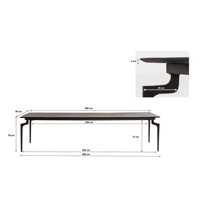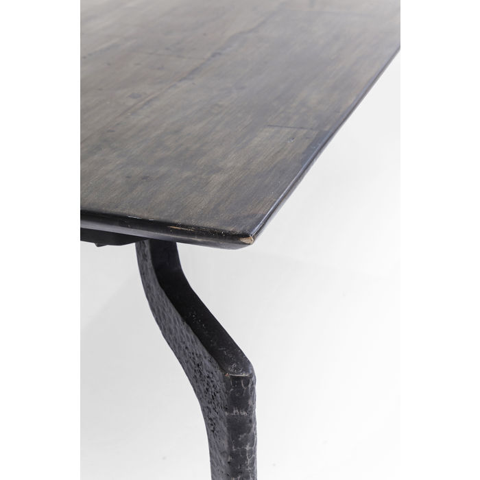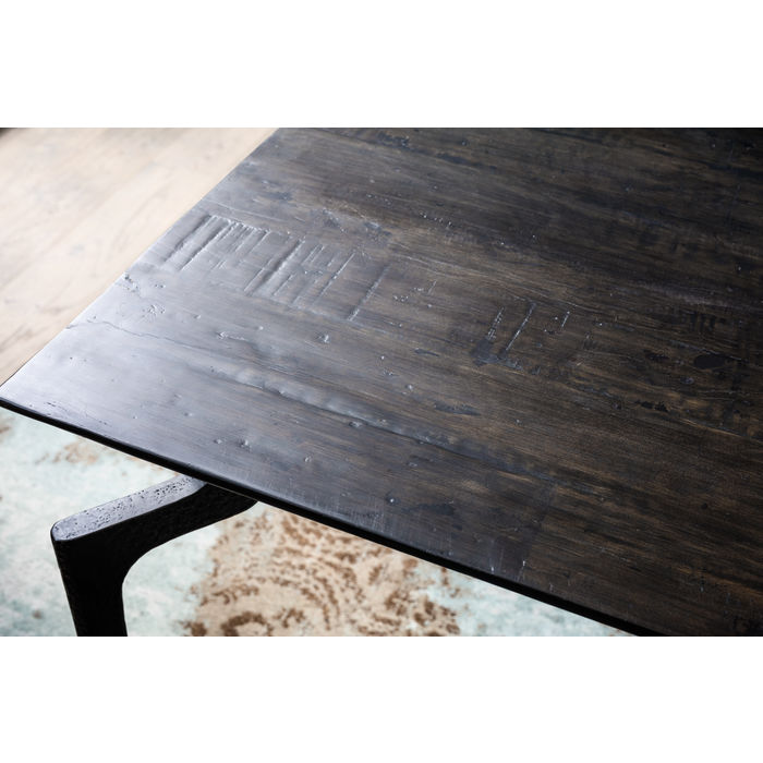 Pravokutni, vrlo veliki blagovaonski stol izrađen od recikliranog, obojenog masivnog drveta s lakiranim, ručno izrađenim metalnim nogama. Pruža prostor za 8-12 osoba. Genijalno oblikovane noge, kosi rubovi stola i živahna struktura ploče od recikliranog drva jedinstveni su. Bilo u blagovaonici ili u kuhinji, ovaj stol od tamnog masivnog drveta ima profinjen i bezvremenski izgled i zahvaljujući filigranskim nogama stvara prekrasno prozračan efekt u sobi.