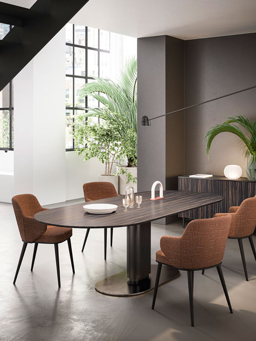 Stol Cameo je stol s oštro definiranom ovalnom siluetom koja ga prožima snažnom osobnošću i ne samo da pruža stabilnost, već omogućuje da se prostor ispod ploče maksimalno iskoristi. Izrađen je od obloženog metala, a središnji stup podržava keramičku ploču koja je dostupna u raznim bojama.
