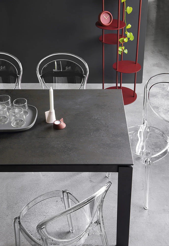 DUCA stol dolazi s izvlačnim sistemom sa vodilicama postavljenim na okvir: izvlačenjem okvira, dvije noge klize na jednu stranu dopuštajući produžnom krilu, postavljenom na metalne vodilice, da se podigne, okrene u položaj i poravna s vrhom s jednostavan pokret. Noge uvijek ostaju na kutevima stola nudeći maksimalnu udobnost svim gostima.