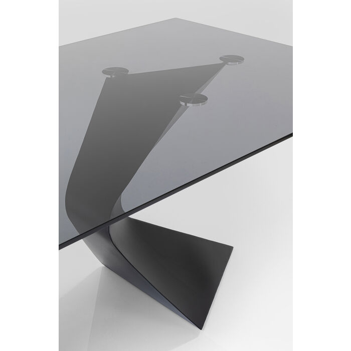 Ovaj blagovaonski stol također bi mogao stajati kao moderna skulptura namještaja u dizajnerskoj galeriji. Odmah ostavlja dojam svojom sofisticiranošću dizajna i elegantnim, pomalo ekscentričnim dodirom. Ploču stola izrađenu od kaljenog stakla debljine 13 milimetara podupiru dvije vješto oblikovane noge. Upečatljiv i zanimljiv blagovaonski stol koji se može stilizirati glamurozno ili minimalistički. Dostupne su i druge verzije.