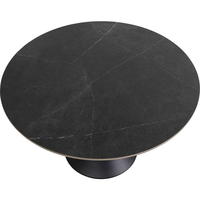 Stol za blagovaonicu s futurističkim dodirom: s ovim skulpturalnim okruglim stolom u potpuno crnoj boji definitivno ćete unijeti moderan komad namještaja u svoj dom! Visokokvalitetna ploča stola izrađena od tamne keramike svojom zrnatošću i izgledom podsjeća na prirodni kamen. Elegantna baza od metala obloženog prahom u obliku tulipana upotpunjuje izgled. Okruglo postolje postaje šire prema dnu i skladno nastavlja okrugle linije blagovaonskog stola. Uz crnu boju također dodajete uzbudljiv kontrast svom stilu opremanja.