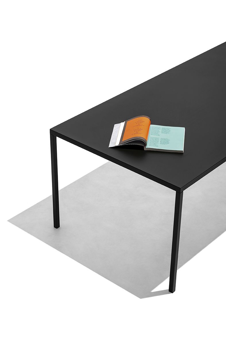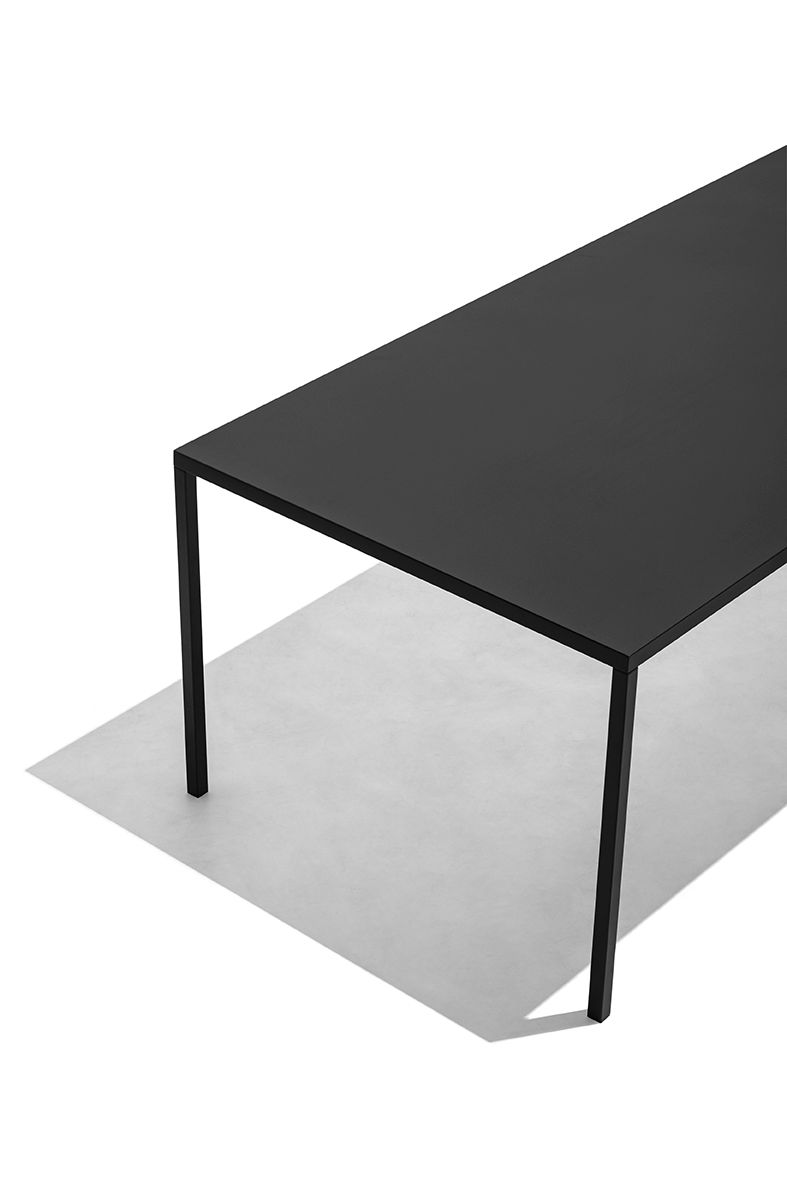 Iron stol s vitkom siluetom u potpunosti izrađenom od metala, pogodan za vanjsku upotrebu. Noge u obliku kvadrata sa gornjom pločom debljine svega 30 mm. Nije na razvlačenje. Dostupan u mat crnoj i mat bijeloj boji.