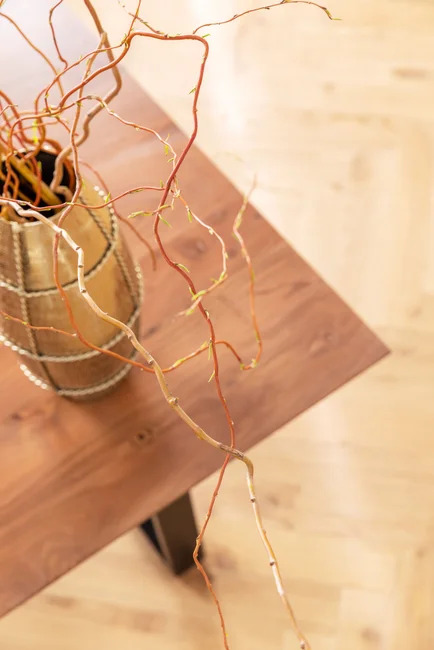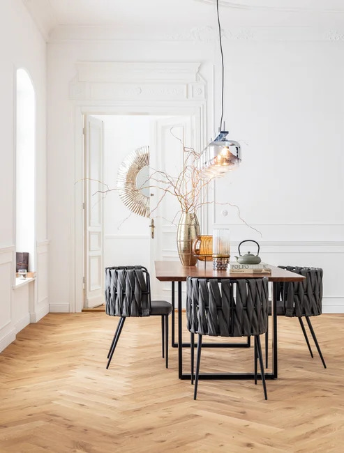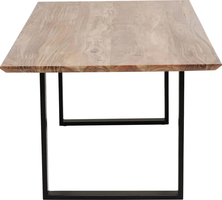 Pravokutni blagovaonski stol za cijelu obitelj s čvrstom pločom od akacije na elegantnim crnim čelićnim nogama u industrijskom stilu. Pruža prostor za 8 osoba. Također se može koristiti i kao stol za sastanke ili ured. Svaka ploča stola je jedinstvena.