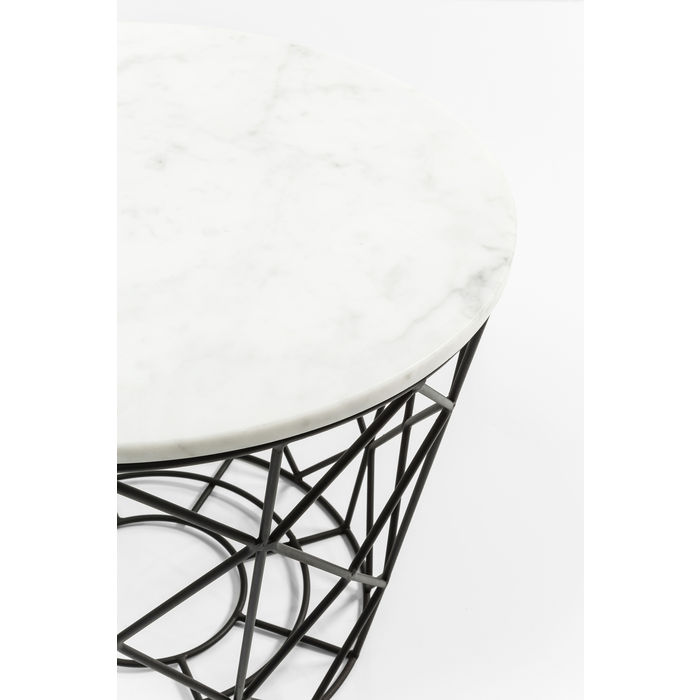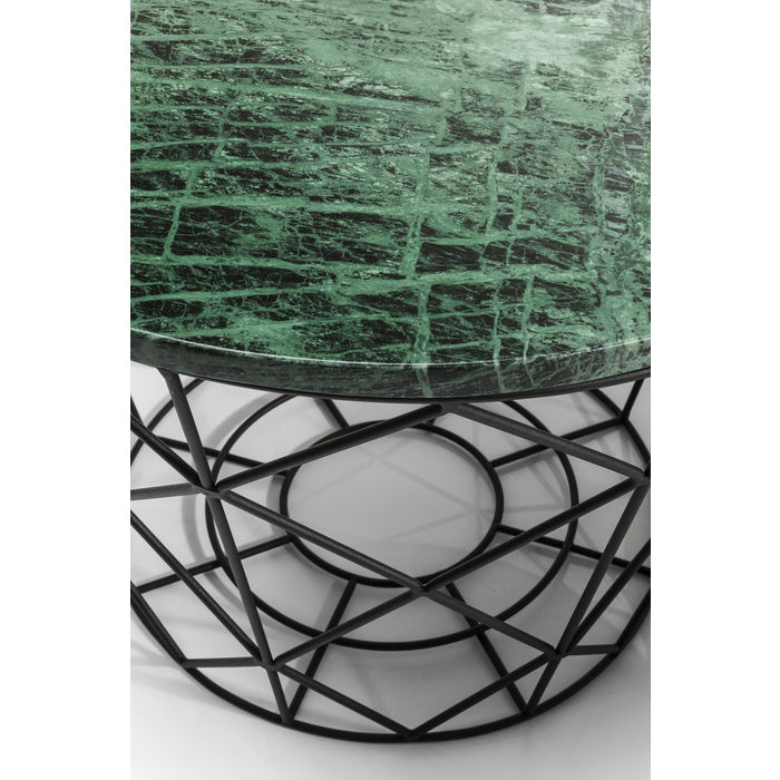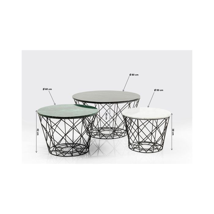 Raskošan komplet od tri stolića. Okvir ovog stola načinjen je od tankih, stilski raspoređenih čeličnih šipki,a mramorne ploče dostupne su u tri različite boje: zelena,crna i bijela. Stolići su različitih dimeznija: 80x80x46, 60x60x42, 50x50x38 h cm