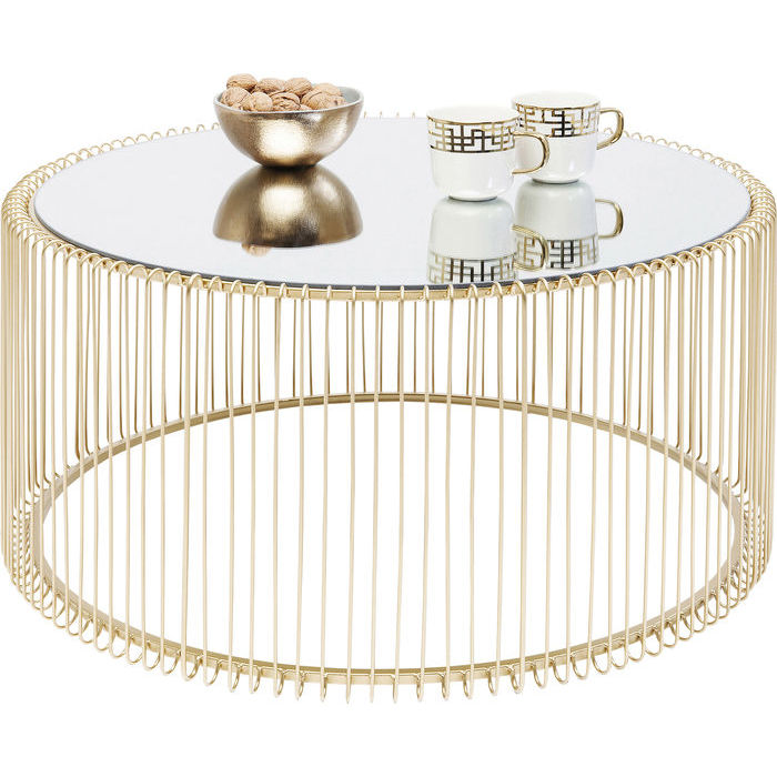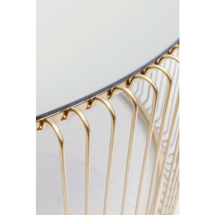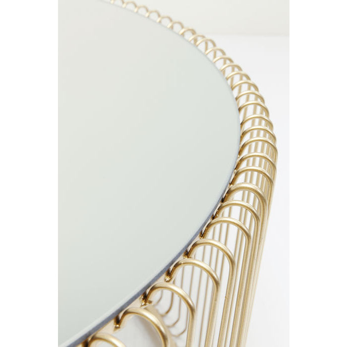 Wire klupski stolić zrači bezvremenskom elegancijom minimalizma. Žičana zaobljena konstrukcija stola izrađena je od čelika u mjedenoj boji i okrunjena staklenom gornjom pločom. Moderna i pomno dizajnirana kompozicija koja unatoč svome upečatljivom izgledu, odaje dojam prozračnosti i lakoće. Wire klupski stolić zaobljenog oblika svakom će kućanstvu dodati potrebnu dozu elegancije. Svojom bojom i dizajnom automatski osvježava prostor i daje mu izvrstan dašak glamura.