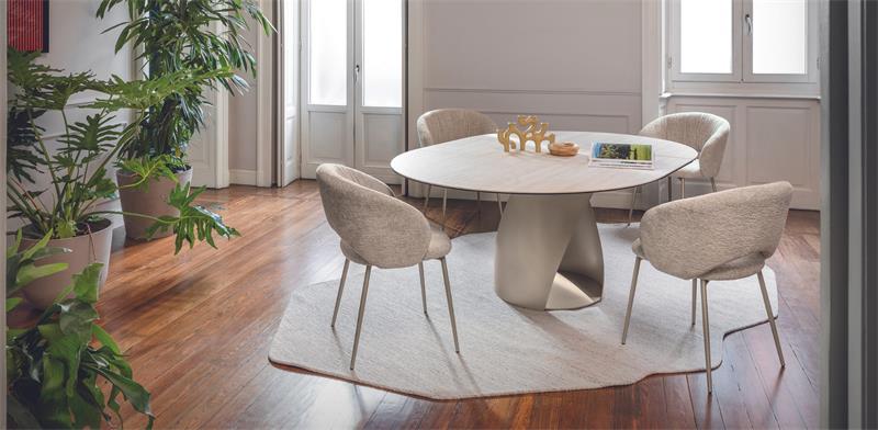 Anime je stolica uravnoteženih proporcija koja nudi maksimalnu udobnost zahvaljujući podstavljenom sjedalu i naslonu. Metalne noge daju joj suvremeni dodir, čineći ju zajedno sa stolom prikladnim za klasična i moderna okruženja, uvijek s elegancijom.