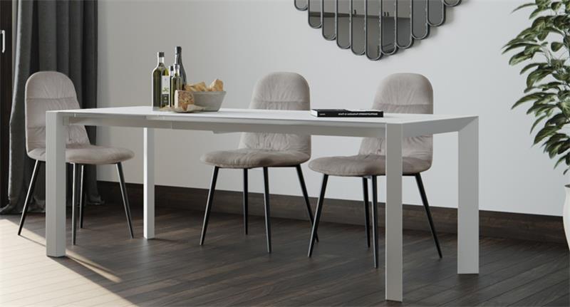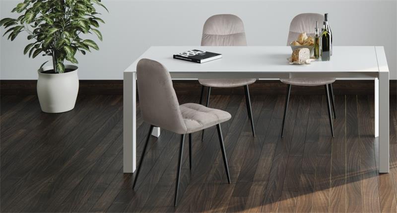 Suvremena stolica za blagovanje presvučena teflonski zaštićenom tkaninom. Ima mat crne metalne noge. Teflonska zaštita čini tkaninu vodootpornom, ne dopuštajući da se voda upije. Novi dizajn čini stolicu udobnom i elegantnom.
