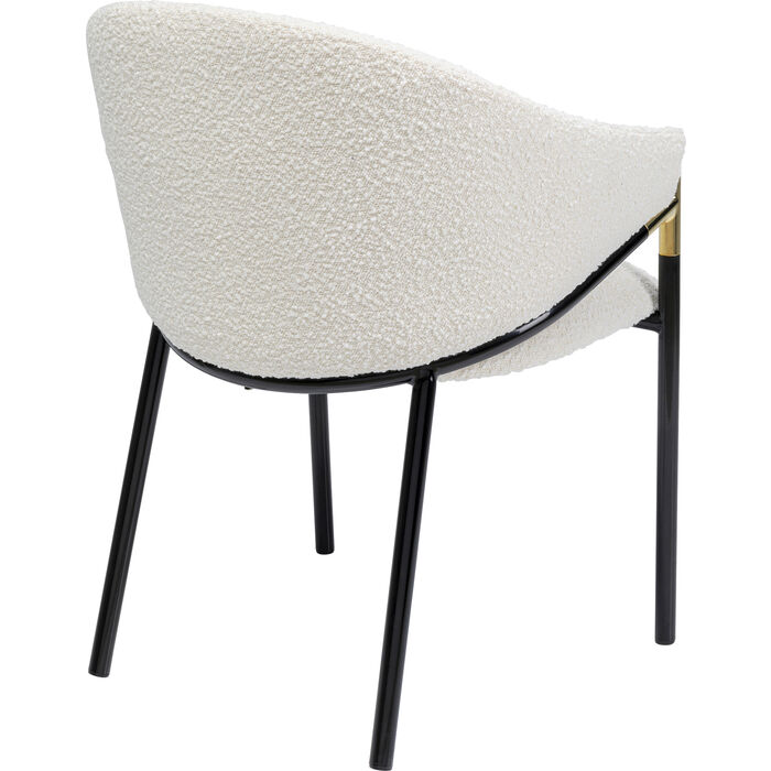 Zaobljeni oblik leđa i pažljivo oblikovani nasloni za ruke pružaju vrhunsku udobnost, čineći ovu stolicu idealnim rješenjem za dnevni boravak, blagovaonicu ili radni prostor. Bijela presvlaka u modernom bouclé stilu dodaje notu luksuza i ističe se svojom sofisticiranom pojavom.