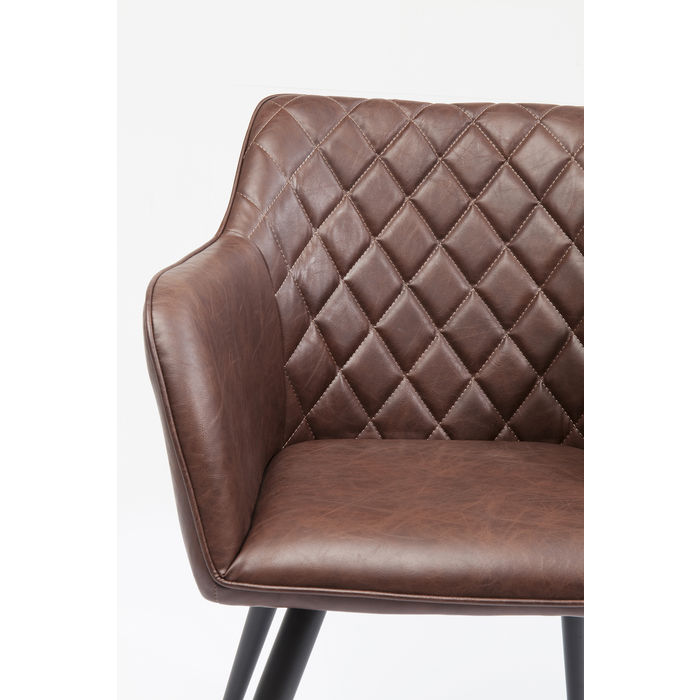 Stolica San Remo udobna je poput fotelje i izgleda jako lijepo za stolom za blagovanje s mekanom i laganom imitacijom kože u smeđoj boji. S prednje strane krase je fino izvezeni dijamantni oblici koji privlače pažnju. Metalne noge su lagane, ali dovoljno čvrste da pruže stabilnost ovoj stolici. Odlično će se uklopiti u urbane i retro interijere. Možete ju kombinirati sa stolom iz iste kolekcije.
