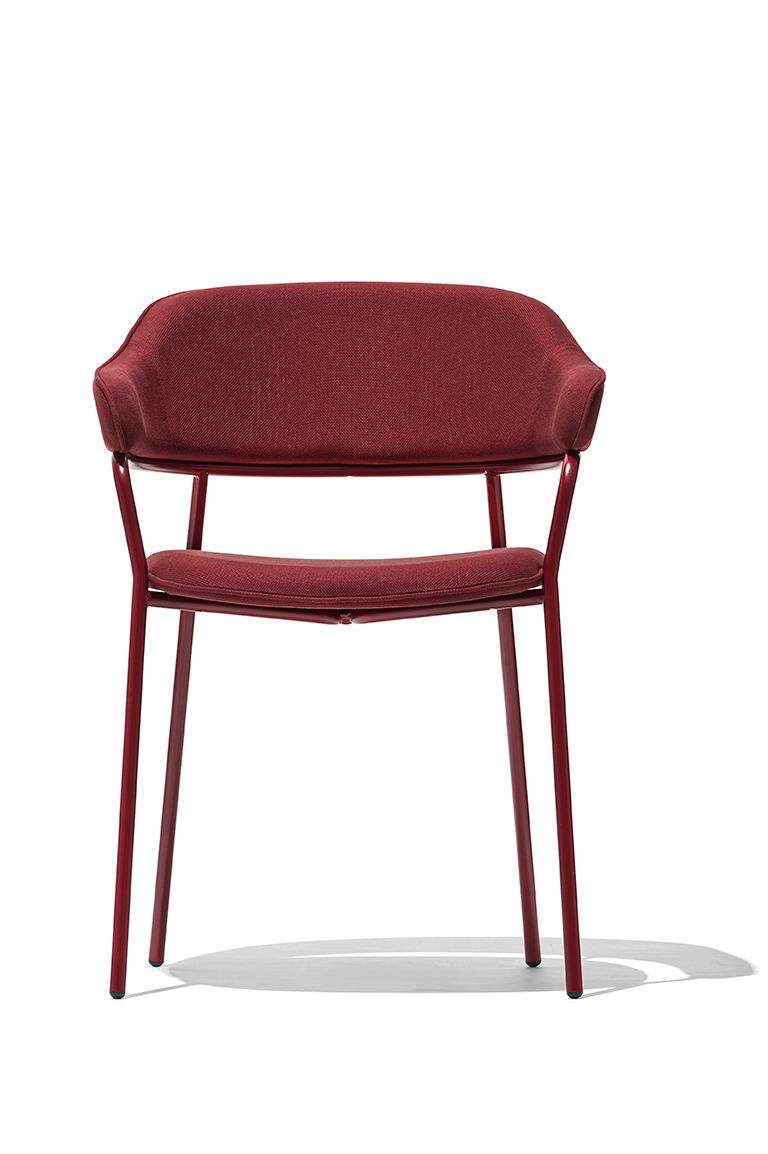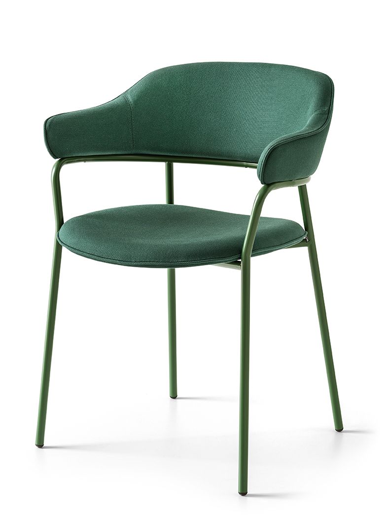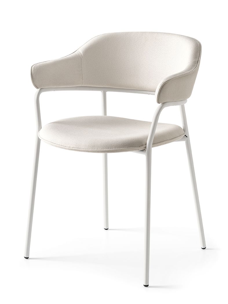 Signorina stolica s četiri metalne noge i presvučenim ergonomskim naslonima za ruke. Podstavljeni i tapecirani naslonjači i sjedalo stolice sa istaknutim šavom. Struktura može biti u više boja, a presvlaka od tkanine ili od umjetne kože, također u više boja.