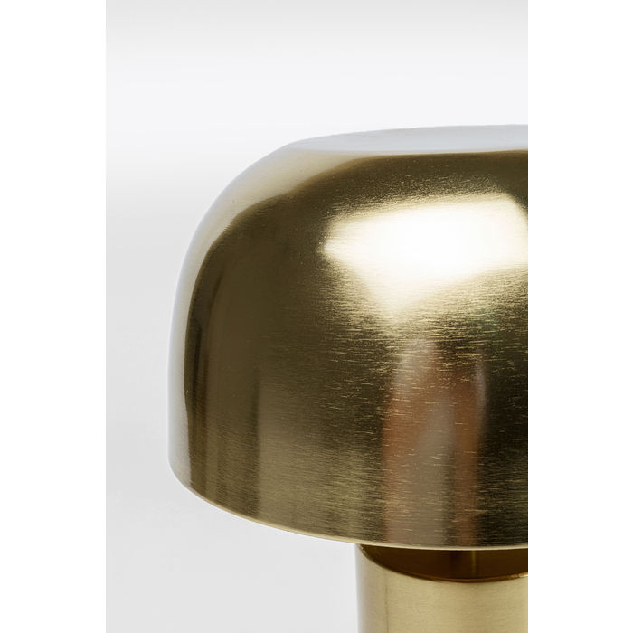Stolna svjetiljka srednje veličine u obliku gljive, izrađena od metala i s cilindričnim postoljem. Svjetiljka je ručni rad. Glamurozni, svjetlucavi mat koji se savršeno uklapa u svaki stil opremanja zbog svog bistrog, bezvremenskog oblika. Zahvaljujući zlatnom sjenilu, stolna svjetiljka pruža toplo, atmosfersko svjetlo. Izgleda dobro na komodama i noćnom ormariću. Upadljiv izgled čak i kad je svjetlo isključeno.