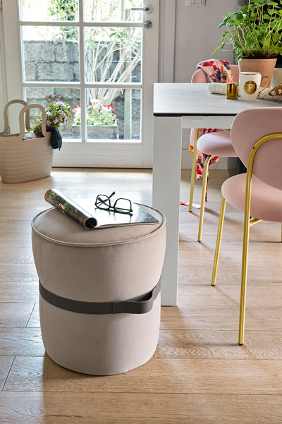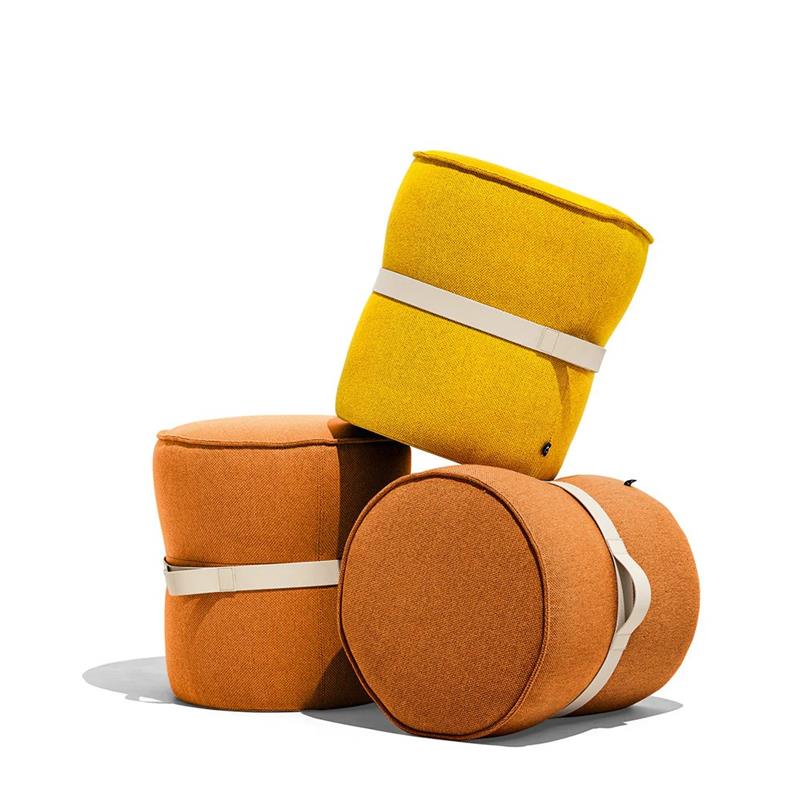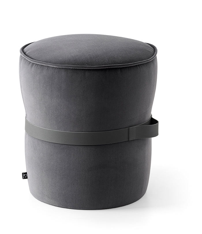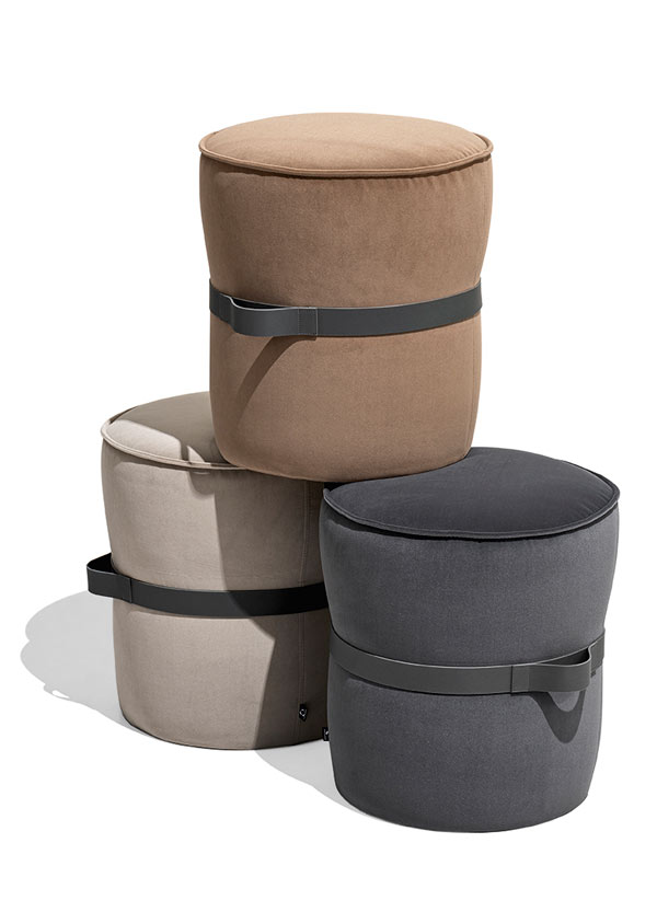 Potpuno podstavljen okrugli tabure presvučen tkaninom sa šavovima oko ruba sjedala. Na sredini ima ukrasnu traku s ručkom od gume. Dostupan je u više boja.