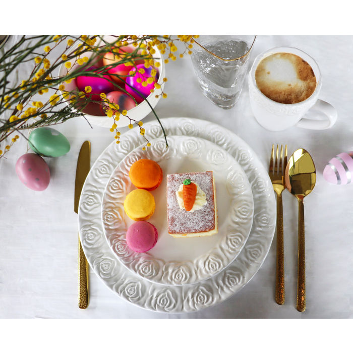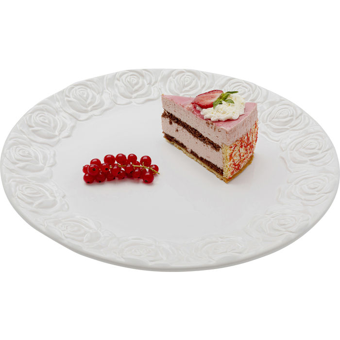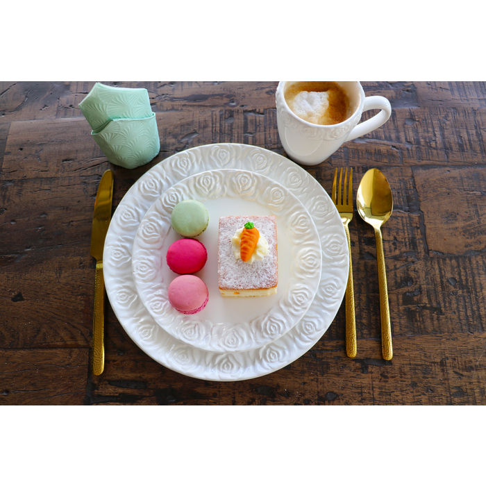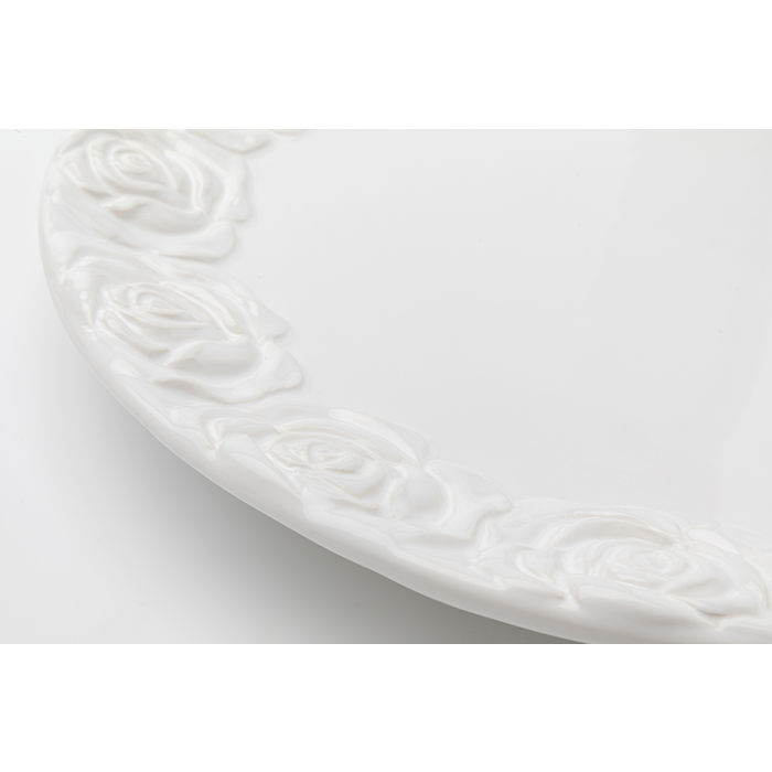 Bijeli tanjur Rosa od ručno izrađene keramike pravi je dragulj na stolu i u kuhinji. Posebna je draž ove serije ukrasni reljef stiliziranih latica ruže.